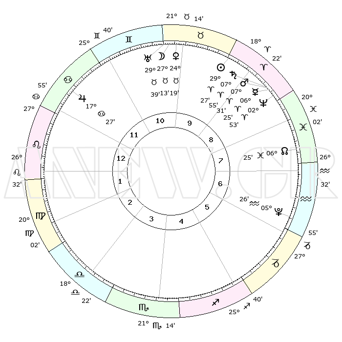 | | ΘΕΣΕΙΣ ΠΛΑΝΗΤΩΝ ΑΣΤΡΟΛΟΓΙΚΟΥ ΧΑΡΤΗ ΤΗΣ ΣΤΙΓΜΗΣ ΑΥΤΗΣ | | | | Πλανήτης | Ζώδιο | Μοίρες | Δεκαήμ. | Σε οίκο | Απόκλιση | | Ακμές των οίκων | | Ηλιος | Κριός | 29°23' | Τρίτο | 10 | 11 N 15 | | 1ος | 08°38' | Λέων | | Σελήνη | Ταύρος | 26°18' | Τρίτο | 10 | 24 N 11 | | 2ος | 00°21' | Παρθένος | | Ερμής | Κριός | 06°19' | Πρώτο | 9 | 00 N 06 | | 3ος | 26°34' | Παρθένος | | Αφροδίτη | Ταύρος | 24°14' | Τρίτο | 10 | 19 N 11 | | 4ος | 28°31' | Ζυγός | | Αρης | Κριός | 07°29' | Πρώτο | 9 | 02 N 05 | | 5ος | 04°12' | Τοξότης | | Δίας | Καρκίνος | 17°27' | Δεύτερο | 12 | 22 N 41 | | 6ος | 08°33' | Αιγόκερως | | Κρόνος | Κριός | 07°55' | Πρώτο | 9 | 01 N 10 | | 7ος | 08°38' | Υδροχόος | | Ουρανός | Ταύρος | 29°39' | Τρίτο | 10 | 19 N 54 | | 8ος | 00°21' | Ιχθείς | | Ποσειδώνας | Κριός | 02°53' | Πρώτο | 9 | 00 S 04 | | 9ος | 26°34' | Ιχθείς | | Πλούτωνας | Υδροχόος | 05°26' | Πρώτο | 6 | 22 S 48 | | 10ος | 28°31' | Κριός | | Β. Δεσμός | Ιχθείς | 06°26' | Πρώτο | 8 | 09 S 09 | | 11ος | 04°12' | Δίδυμοι | | Ωροσκόπος | Λέων | 08°38' | Πρώτο | | | 12ος | 08°33' | Καρκίνος | | Μεσουράνημα | Κριός | 28°31' | Τρίτο | | | |
