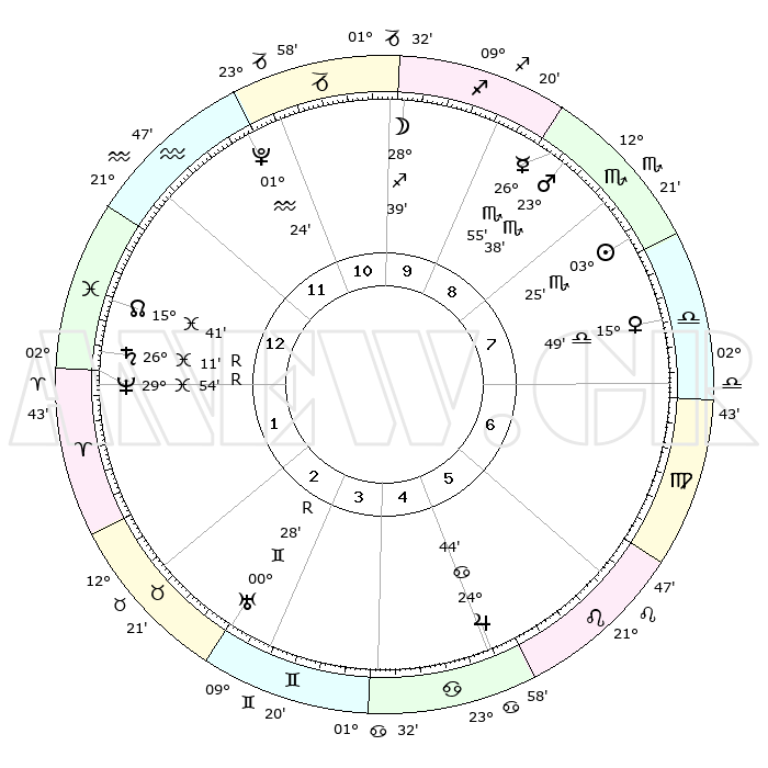 | | ΘΕΣΕΙΣ ΠΛΑΝΗΤΩΝ ΑΣΤΡΟΛΟΓΙΚΟΥ ΧΑΡΤΗ ΤΗΣ ΣΤΙΓΜΗΣ ΑΥΤΗΣ | | | | Πλανήτης | Ζώδιο | Μοίρες | Δεκαήμ. | Σε οίκο | Απόκλιση | | Ακμές των οίκων | | Ηλιος | Σκορπιός | 03°19' | Πρώτο | 9 | 12 S 37 | | 1ος | 05°06' | Υδροχόος | | Σελήνη | Τοξότης | 27°22' | Τρίτο | 11 | 28 S 27 | | 2ος | 19°57' | Ιχθείς | | Ερμής | Σκορπιός | 26°48' | Τρίτο | 10 | 22 S 05 | | 3ος | 27°32' | Κριός | | Αφροδίτη | Ζυγός | 15°41' | Δεύτερο | 8 | 04 S 46 | | 4ος | 25°09' | Ταύρος | | Αρης | Σκορπιός | 23°34' | Τρίτο | 9 | 18 S 59 | | 5ος | 17°35' | Δίδυμοι | | Δίας | Καρκίνος | 24°43' | Τρίτο | 6 | 21 N 15 | | 6ος | 09°13' | Καρκίνος | | Κρόνος | Ιχθείς | 26°12'R | Τρίτο | 2 | 03 S 47 | | 7ος | 05°06' | Λέων | | Ουρανός | Δίδυμοι | 00°29'R | Πρώτο | 4 | 20 N 02 | | 8ος | 19°57' | Παρθένος | | Ποσειδώνας | Ιχθείς | 29°54'R | Τρίτο | 2 | 01 S 18 | | 9ος | 27°32' | Ζυγός | | Πλούτωνας | Υδροχόος | 01°24' | Πρώτο | 12 | 23 S 31 | | 10ος | 25°09' | Σκορπιός | | Β. Δεσμός | Ιχθείς | 15°42' | Δεύτερο | 1 | 05 S 38 | | 11ος | 17°35' | Τοξότης | | Ωροσκόπος | Υδροχόος | 05°06' | Πρώτο | | | 12ος | 09°13' | Αιγόκερως | | Μεσουράνημα | Σκορπιός | 25°09' | Τρίτο | | | |