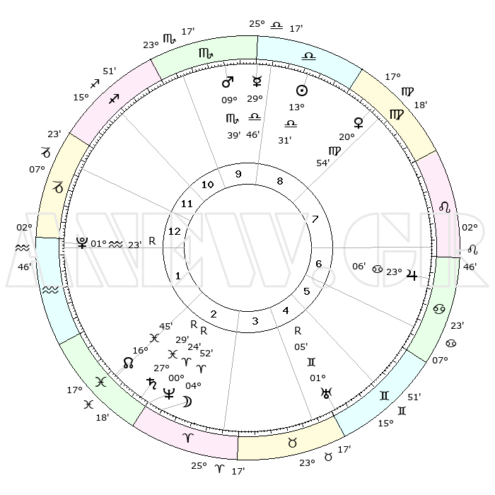 | ΘΕΣΕΙΣ ΠΛΑΝΗΤΩΝ ΑΣΤΡΟΛΟΓΙΚΟΥ ΧΑΡΤΗ ΤΗΣ ΣΤΙΓΜΗΣ ΑΥΤΗΣ | | Πλανήτης | Ζώδιο | Μοίρες | Δεκαήμ. | Σε οίκο | Απόκλιση | | Ακμές των οίκων | Ηλιος | Ζυγός | 13°26' | Δεύτερο | 9 | 05 S 18 | | 1ος | 01°13' | Αιγόκερως | Σελήνη | Κριός | 03°38' | Πρώτο | 3 | 02 N 43 | | 2ος | 08°41' | Υδροχόος | Ερμής | Ζυγός | 29°39' | Τρίτο | 10 | 12 S 03 | | 3ος | 18°46' | Ιχθείς | Αφροδίτη | Παρθένος | 20°48' | Τρίτο | 9 | 04 N 56 | | 4ος | 22°30' | Κριός | Αρης | Σκορπιός | 09°36' | Πρώτο | 10 | 14 S 49 | | 5ος | 18°38' | Ταύρος | Δίας | Καρκίνος | 23°06' | Τρίτο | 7 | 21 N 29 | | 6ος | 10°21' | Δίδυμοι | Κρόνος | Ιχθείς | 27°29'R | Τρίτο | 3 | 03 S 18 | | 7ος | 01°13' | Καρκίνος | Ουρανός | Δίδυμοι | 01°05'R | Πρώτο | 5 | 20 N 10 | | 8ος | 08°41' | Λέων | Ποσειδώνας | Κριός | 00°24'R | Πρώτο | 3 | 01 S 06 | | 9ος | 18°46' | Παρθένος | Πλούτωνας | Υδροχόος | 01°23'R | Πρώτο | 1 | 23 S 32 | | 10ος | 22°30' | Ζυγός | Β. Δεσμός | Ιχθείς | 16°45' | Δεύτερο | 2 | 05 S 14 | | 11ος | 18°38' | Σκορπιός | Ωροσκόπος | Αιγόκερως | 01°13' | Πρώτο | | | 12ος | 10°21' | Τοξότης | Μεσουράνημα | Ζυγός | 22°30' | Τρίτο | | | |