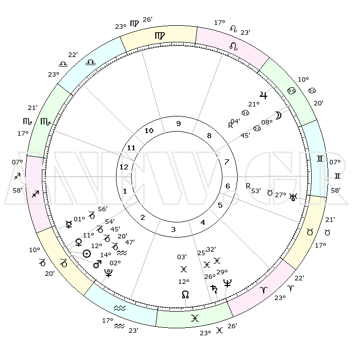 | | ΘΕΣΕΙΣ ΠΛΑΝΗΤΩΝ ΑΣΤΡΟΛΟΓΙΚΟΥ ΧΑΡΤΗ ΤΗΣ ΣΤΙΓΜΗΣ ΑΥΤΗΣ | | | | Πλανήτης | Ζώδιο | Μοίρες | Δεκαήμ. | Σε οίκο | Απόκλιση | | Ακμές των οίκων | | Ηλιος | Αιγόκερως | 12°40' | Δεύτερο | 2 | 22 S 50 | | 1ος | 16°40' | Σκορπιός | | Σελήνη | Καρκίνος | 07°40' | Πρώτο | 8 | 27 N 43 | | 2ος | 16°18' | Τοξότης | | Ερμής | Αιγόκερως | 01°49' | Πρώτο | 2 | 24 S 13 | | 3ος | 19°60' | Αιγόκερως | | Αφροδίτη | Αιγόκερως | 11°49' | Δεύτερο | 2 | 23 S 29 | | 4ος | 25°23' | Υδροχόος | | Αρης | Αιγόκερως | 14°17' | Δεύτερο | 2 | 23 S 34 | | 5ος | 27°42' | Ιχθείς | | Δίας | Καρκίνος | 21°05'R | Τρίτο | 9 | 22 N 01 | | 6ος | 24°32' | Κριός | | Κρόνος | Ιχθείς | 26°25' | Τρίτο | 4 | 03 S 30 | | 7ος | 16°40' | Ταύρος | | Ουρανός | Ταύρος | 27°53'R | Τρίτο | 7 | 19 N 30 | | 8ος | 16°18' | Δίδυμοι | | Ποσειδώνας | Ιχθείς | 29°32' | Τρίτο | 5 | 01 S 24 | | 9ος | 19°60' | Καρκίνος | | Πλούτωνας | Υδροχόος | 02°47' | Πρώτο | 3 | 23 S 12 | | 10ος | 25°23' | Λέων | | Β. Δεσμός | Ιχθείς | 12°04' | Δεύτερο | 4 | 07 S 02 | | 11ος | 27°42' | Παρθένος | | Ωροσκόπος | Σκορπιός | 16°40' | Δεύτερο | | | 12ος | 24°32' | Ζυγός | | Μεσουράνημα | Λέων | 25°23' | Τρίτο | | | |
