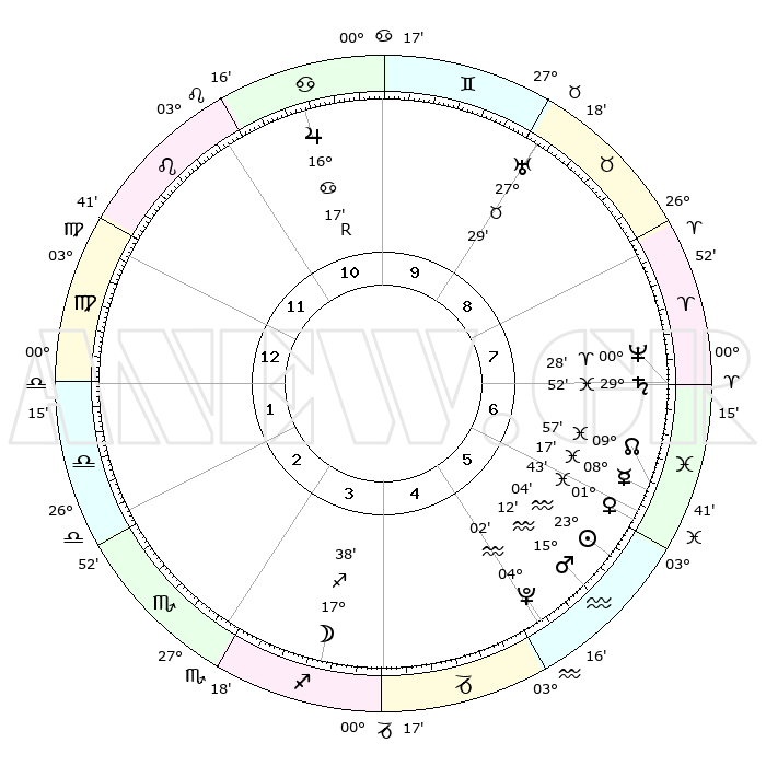 | | ΘΕΣΕΙΣ ΠΛΑΝΗΤΩΝ ΑΣΤΡΟΛΟΓΙΚΟΥ ΧΑΡΤΗ ΤΗΣ ΣΤΙΓΜΗΣ ΑΥΤΗΣ | | | | Πλανήτης | Ζώδιο | Μοίρες | Δεκαήμ. | Σε οίκο | Απόκλιση | | Ακμές των οίκων | | Ηλιος | Υδροχόος | 22°60' | Τρίτο | 6 | 13 S 51 | | 1ος | 10°01' | Παρθένος | | Σελήνη | Τοξότης | 16°49' | Δεύτερο | 4 | 27 S 58 | | 2ος | 04°54' | Ζυγός | | Ερμής | Ιχθείς | 08°10' | Πρώτο | 6 | 09 S 04 | | 3ος | 04°21' | Σκορπιός | | Αφροδίτη | Ιχθείς | 01°38' | Πρώτο | 6 | 12 S 15 | | 4ος | 07°18' | Τοξότης | | Αρης | Υδροχόος | 15°09' | Δεύτερο | 6 | 17 S 19 | | 5ος | 10°54' | Αιγόκερως | | Δίας | Καρκίνος | 16°18'R | Δεύτερο | 11 | 22 N 46 | | 6ος | 12°11' | Υδροχόος | | Κρόνος | Ιχθείς | 29°52' | Τρίτο | 7 | 02 S 02 | | 7ος | 10°01' | Ιχθείς | | Ουρανός | Ταύρος | 27°29' | Τρίτο | 9 | 19 N 25 | | 8ος | 04°54' | Κριός | | Ποσειδώνας | Κριός | 00°28' | Πρώτο | 7 | 01 S 01 | | 9ος | 04°21' | Ταύρος | | Πλούτωνας | Υδροχόος | 04°02' | Πρώτο | 5 | 22 S 58 | | 10ος | 07°18' | Δίδυμοι | | Β. Δεσμός | Ιχθείς | 09°58' | Πρώτο | 6 | 07 S 50 | | 11ος | 10°54' | Καρκίνος | | Ωροσκόπος | Παρθένος | 10°01' | Δεύτερο | | | 12ος | 12°11' | Λέων | | Μεσουράνημα | Δίδυμοι | 07°18' | Πρώτο | | | |