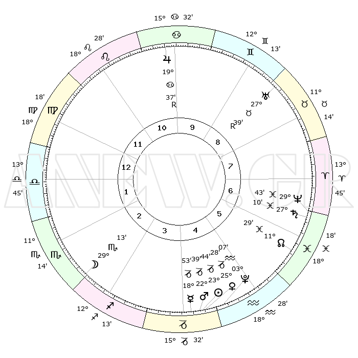 | | ΘΕΣΕΙΣ ΠΛΑΝΗΤΩΝ ΑΣΤΡΟΛΟΓΙΚΟΥ ΧΑΡΤΗ ΤΗΣ ΣΤΙΓΜΗΣ ΑΥΤΗΣ | | | | Πλανήτης | Ζώδιο | Μοίρες | Δεκαήμ. | Σε οίκο | Απόκλιση | | Ακμές των οίκων | | Ηλιος | Αιγόκερως | 23°39' | Τρίτο | 4 | 21 S 22 | | 1ος | 21°39' | Παρθένος | | Σελήνη | Σκορπιός | 28°20' | Τρίτο | 3 | 24 S 40 | | 2ος | 17°35' | Ζυγός | | Ερμής | Αιγόκερως | 18°46' | Δεύτερο | 4 | 23 S 49 | | 3ος | 17°41' | Σκορπιός | | Αφροδίτη | Αιγόκερως | 25°22' | Τρίτο | 5 | 21 S 59 | | 4ος | 20°36' | Τοξότης | | Αρης | Αιγόκερως | 22°35' | Τρίτο | 4 | 22 S 30 | | 5ος | 23°45' | Αιγόκερως | | Δίας | Καρκίνος | 19°38'R | Δεύτερο | 10 | 22 N 16 | | 6ος | 24°30' | Υδροχόος | | Κρόνος | Ιχθείς | 27°09' | Τρίτο | 7 | 03 S 10 | | 7ος | 21°39' | Ιχθείς | | Ουρανός | Ταύρος | 27°39'R | Τρίτο | 9 | 19 N 26 | | 8ος | 17°35' | Κριός | | Ποσειδώνας | Ιχθείς | 29°43' | Τρίτο | 7 | 01 S 20 | | 9ος | 17°41' | Ταύρος | | Πλούτωνας | Υδροχόος | 03°07' | Πρώτο | 5 | 23 S 08 | | 10ος | 20°36' | Δίδυμοι | | Β. Δεσμός | Ιχθείς | 11°29' | Δεύτερο | 6 | 07 S 15 | | 11ος | 23°45' | Καρκίνος | | Ωροσκόπος | Παρθένος | 21°39' | Τρίτο | | | 12ος | 24°30' | Λέων | | Μεσουράνημα | Δίδυμοι | 20°36' | Τρίτο | | | |