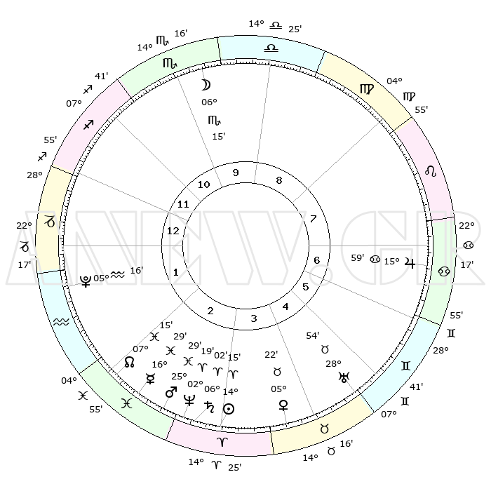 | | ΘΕΣΕΙΣ ΠΛΑΝΗΤΩΝ ΑΣΤΡΟΛΟΓΙΚΟΥ ΧΑΡΤΗ ΤΗΣ ΣΤΙΓΜΗΣ ΑΥΤΗΣ | | | | Πλανήτης | Ζώδιο | Μοίρες | Δεκαήμ. | Σε οίκο | Απόκλιση | | Ακμές των οίκων | | Ηλιος | Κριός | 14°12' | Δεύτερο | 3 | 05 N 36 | | 1ος | 00°42' | Αιγόκερως | | Σελήνη | Σκορπιός | 05°32' | Πρώτο | 10 | 17 S 27 | | 2ος | 08°01' | Υδροχόος | | Ερμής | Ιχθείς | 16°26' | Δεύτερο | 2 | 06 S 57 | | 3ος | 18°04' | Ιχθείς | | Αφροδίτη | Ταύρος | 05°17' | Πρώτο | 4 | 12 N 59 | | 4ος | 21°54' | Κριός | | Αρης | Ιχθείς | 25°26' | Τρίτο | 3 | 02 S 46 | | 5ος | 18°06' | Ταύρος | | Δίας | Καρκίνος | 15°59' | Δεύτερο | 7 | 22 N 51 | | 6ος | 09°52' | Δίδυμοι | | Κρόνος | Κριός | 06°02' | Πρώτο | 3 | 00 N 26 | | 7ος | 00°42' | Καρκίνος | | Ουρανός | Ταύρος | 28°54' | Τρίτο | 5 | 19 N 44 | | 8ος | 08°01' | Λέων | | Ποσειδώνας | Κριός | 02°19' | Πρώτο | 3 | 00 S 17 | | 9ος | 18°04' | Παρθένος | | Πλούτωνας | Υδροχόος | 05°16' | Πρώτο | 1 | 22 S 47 | | 10ος | 21°54' | Ζυγός | | Β. Δεσμός | Ιχθείς | 07°15' | Πρώτο | 2 | 08 S 51 | | 11ος | 18°06' | Σκορπιός | | Ωροσκόπος | Αιγόκερως | 00°42' | Πρώτο | | | 12ος | 09°52' | Τοξότης | | Μεσουράνημα | Ζυγός | 21°54' | Τρίτο | | | |