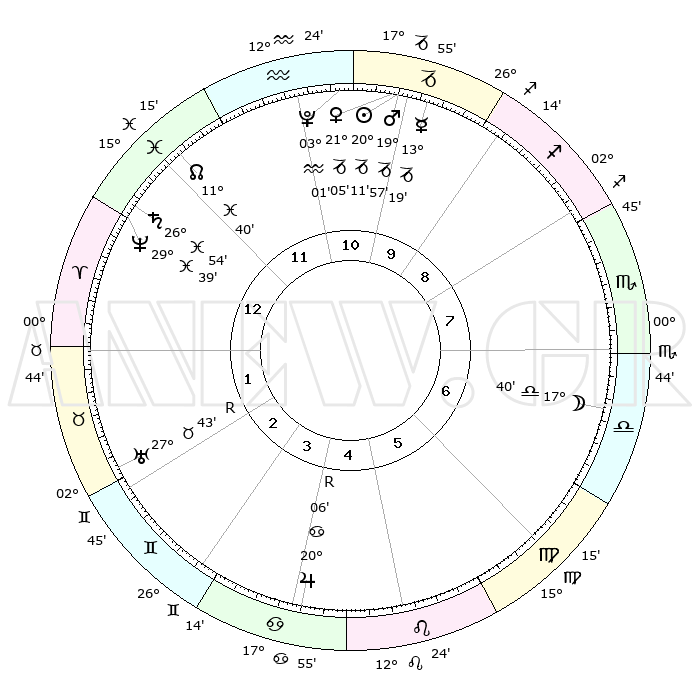 | | ΘΕΣΕΙΣ ΠΛΑΝΗΤΩΝ ΑΣΤΡΟΛΟΓΙΚΟΥ ΧΑΡΤΗ ΤΗΣ ΣΤΙΓΜΗΣ ΑΥΤΗΣ | | | | Πλανήτης | Ζώδιο | Μοίρες | Δεκαήμ. | Σε οίκο | Απόκλιση | | Ακμές των οίκων | | Ηλιος | Αιγόκερως | 19°47' | Δεύτερο | 3 | 21 S 59 | | 1ος | 15°34' | Σκορπιός | | Σελήνη | Ζυγός | 12°50' | Δεύτερο | 11 | 07 S 36 | | 2ος | 15°06' | Τοξότης | | Ερμής | Αιγόκερως | 12°42' | Δεύτερο | 2 | 24 S 16 | | 3ος | 18°39' | Αιγόκερως | | Αφροδίτη | Αιγόκερως | 20°35' | Τρίτο | 3 | 22 S 40 | | 4ος | 23°58' | Υδροχόος | | Αρης | Αιγόκερως | 19°39' | Δεύτερο | 3 | 22 S 56 | | 5ος | 26°21' | Ιχθείς | | Δίας | Καρκίνος | 20°09'R | Τρίτο | 9 | 22 N 11 | | 6ος | 23°19' | Κριός | | Κρόνος | Ιχθείς | 26°52' | Τρίτο | 5 | 03 S 17 | | 7ος | 15°34' | Ταύρος | | Ουρανός | Ταύρος | 27°44'R | Τρίτο | 7 | 19 N 27 | | 8ος | 15°06' | Δίδυμοι | | Ποσειδώνας | Ιχθείς | 29°39' | Τρίτο | 5 | 01 S 22 | | 9ος | 18°39' | Καρκίνος | | Πλούτωνας | Υδροχόος | 03°00' | Πρώτο | 3 | 23 S 10 | | 10ος | 23°58' | Λέων | | Β. Δεσμός | Ιχθείς | 11°41' | Δεύτερο | 4 | 07 S 11 | | 11ος | 26°21' | Παρθένος | | Ωροσκόπος | Σκορπιός | 15°34' | Δεύτερο | | | 12ος | 23°19' | Ζυγός | | Μεσουράνημα | Λέων | 23°58' | Τρίτο | | | |