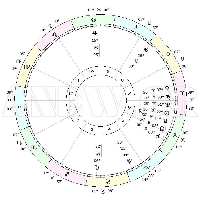 | | ΘΕΣΕΙΣ ΠΛΑΝΗΤΩΝ ΑΣΤΡΟΛΟΓΙΚΟΥ ΧΑΡΤΗ ΤΗΣ ΣΤΙΓΜΗΣ ΑΥΤΗΣ | | | | Πλανήτης | Ζώδιο | Μοίρες | Δεκαήμ. | Σε οίκο | Απόκλιση | | Ακμές των οίκων | | Ηλιος | Ιχθείς | 22°07' | Τρίτο | 6 | 03 S 08 | | 1ος | 22°41' | Παρθένος | | Σελήνη | Αιγόκερως | 06°10' | Πρώτο | 4 | 27 S 59 | | 2ος | 18°42' | Ζυγός | | Ερμής | Ιχθείς | 11°53'R | Δεύτερο | 6 | 04 S 24 | | 3ος | 18°50' | Σκορπιός | | Αφροδίτη | Κριός | 07°46' | Πρώτο | 7 | 02 N 03 | | 4ος | 21°46' | Τοξότης | | Αρης | Ιχθείς | 07°58' | Πρώτο | 6 | 09 S 36 | | 5ος | 24°53' | Αιγόκερως | | Δίας | Καρκίνος | 15°05' | Δεύτερο | 10 | 22 N 56 | | 6ος | 25°36' | Υδροχόος | | Κρόνος | Κριός | 03°15' | Πρώτο | 7 | 00 S 39 | | 7ος | 22°41' | Ιχθείς | | Ουρανός | Ταύρος | 28°02' | Τρίτο | 9 | 19 N 33 | | 8ος | 18°42' | Κριός | | Ποσειδώνας | Κριός | 01°29' | Πρώτο | 7 | 00 S 37 | | 9ος | 18°50' | Ταύρος | | Πλούτωνας | Υδροχόος | 04°50' | Πρώτο | 5 | 22 S 50 | | 10ος | 21°46' | Δίδυμοι | | Β. Δεσμός | Ιχθείς | 08°26' | Πρώτο | 6 | 08 S 24 | | 11ος | 24°53' | Καρκίνος | | Ωροσκόπος | Παρθένος | 22°41' | Τρίτο | | | 12ος | 25°36' | Λέων | | Μεσουράνημα | Δίδυμοι | 21°46' | Τρίτο | | | |