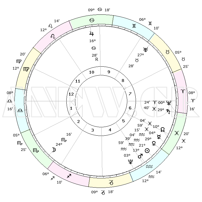 | | ΘΕΣΕΙΣ ΠΛΑΝΗΤΩΝ ΑΣΤΡΟΛΟΓΙΚΟΥ ΧΑΡΤΗ ΤΗΣ ΣΤΙΓΜΗΣ ΑΥΤΗΣ | | | | Πλανήτης | Ζώδιο | Μοίρες | Δεκαήμ. | Σε οίκο | Απόκλιση | | Ακμές των οίκων | | Ηλιος | Υδροχόος | 21°01' | Τρίτο | 5 | 14 S 29 | | 1ος | 21°04' | Παρθένος | | Σελήνη | Σκορπιός | 23°34' | Τρίτο | 3 | 23 S 34 | | 2ος | 16°57' | Ζυγός | | Ερμής | Ιχθείς | 04°54' | Πρώτο | 6 | 10 S 35 | | 3ος | 17°01' | Σκορπιός | | Αφροδίτη | Υδροχόος | 29°11' | Τρίτο | 6 | 13 S 07 | | 4ος | 19°57' | Τοξότης | | Αρης | Υδροχόος | 13°37' | Δεύτερο | 5 | 17 S 45 | | 5ος | 23°06' | Αιγόκερως | | Δίας | Καρκίνος | 16°28'R | Δεύτερο | 10 | 22 N 44 | | 6ος | 23°53' | Υδροχόος | | Κρόνος | Ιχθείς | 29°39' | Τρίτο | 7 | 02 S 07 | | 7ος | 21°04' | Ιχθείς | | Ουρανός | Ταύρος | 27°28' | Τρίτο | 9 | 19 N 25 | | 8ος | 16°57' | Κριός | | Ποσειδώνας | Κριός | 00°24' | Πρώτο | 7 | 01 S 03 | | 9ος | 17°01' | Ταύρος | | Πλούτωνας | Υδροχόος | 03°59' | Πρώτο | 5 | 22 S 58 | | 10ος | 19°57' | Δίδυμοι | | Β. Δεσμός | Ιχθείς | 10°04' | Δεύτερο | 6 | 07 S 48 | | 11ος | 23°06' | Καρκίνος | | Ωροσκόπος | Παρθένος | 21°04' | Τρίτο | | | 12ος | 23°53' | Λέων | | Μεσουράνημα | Δίδυμοι | 19°57' | Δεύτερο | | | |