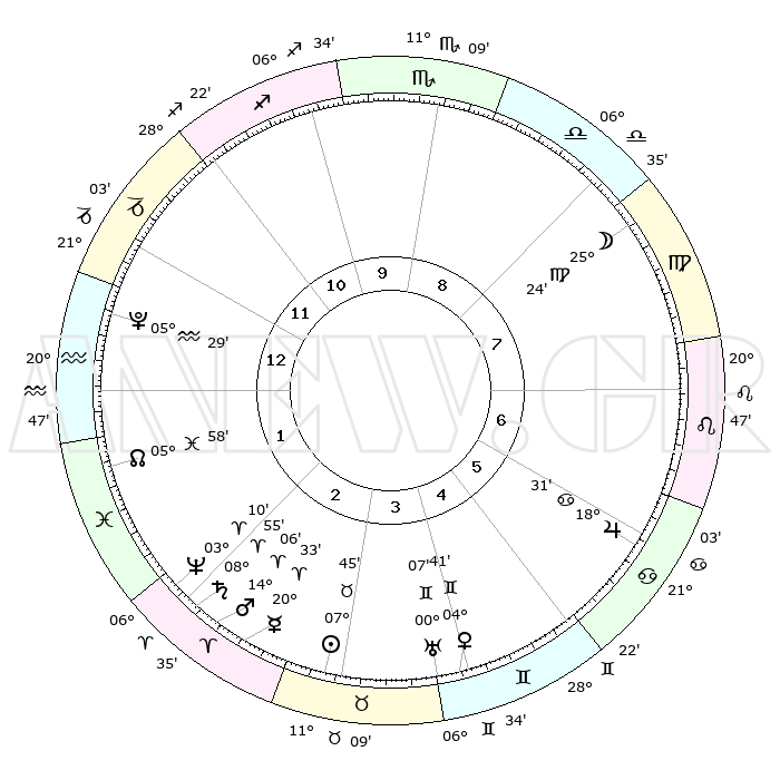 | | ΘΕΣΕΙΣ ΠΛΑΝΗΤΩΝ ΑΣΤΡΟΛΟΓΙΚΟΥ ΧΑΡΤΗ ΤΗΣ ΣΤΙΓΜΗΣ ΑΥΤΗΣ | | | | Πλανήτης | Ζώδιο | Μοίρες | Δεκαήμ. | Σε οίκο | Απόκλιση | | Ακμές των οίκων | | Ηλιος | Ταύρος | 07°41' | Πρώτο | 3 | 14 N 04 | | 1ος | 21°50' | Αιγόκερως | | Σελήνη | Παρθένος | 24°35' | Τρίτο | 8 | 00 N 46 | | 2ος | 04°22' | Ιχθείς | | Ερμής | Κριός | 20°26' | Τρίτο | 3 | 05 N 55 | | 3ος | 13°55' | Κριός | | Αφροδίτη | Δίδυμοι | 04°36' | Πρώτο | 4 | 21 N 48 | | 4ος | 13°51' | Ταύρος | | Αρης | Κριός | 14°03' | Δεύτερο | 3 | 04 N 42 | | 5ος | 07°19' | Δίδυμοι | | Δίας | Καρκίνος | 18°30' | Δεύτερο | 6 | 22 N 32 | | 6ος | 28°32' | Δίδυμοι | | Κρόνος | Κριός | 08°55' | Πρώτο | 2 | 01 N 32 | | 7ος | 21°50' | Καρκίνος | | Ουρανός | Δίδυμοι | 00°07' | Πρώτο | 4 | 20 N 00 | | 8ος | 04°22' | Παρθένος | | Ποσειδώνας | Κριός | 03°10' | Πρώτο | 2 | 00 N 03 | | 9ος | 13°55' | Ζυγός | | Πλούτωνας | Υδροχόος | 05°29' | Πρώτο | 1 | 22 S 48 | | 10ος | 13°51' | Σκορπιός | | Β. Δεσμός | Ιχθείς | 05°59' | Πρώτο | 2 | 09 S 19 | | 11ος | 07°19' | Τοξότης | | Ωροσκόπος | Αιγόκερως | 21°50' | Τρίτο | | | 12ος | 28°32' | Τοξότης | | Μεσουράνημα | Σκορπιός | 13°51' | Δεύτερο | | | |