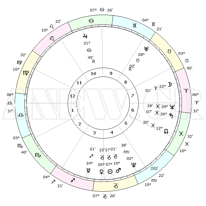 | | ΘΕΣΕΙΣ ΠΛΑΝΗΤΩΝ ΑΣΤΡΟΛΟΓΙΚΟΥ ΧΑΡΤΗ ΤΗΣ ΣΤΙΓΜΗΣ ΑΥΤΗΣ | | | | Πλανήτης | Ζώδιο | Μοίρες | Δεκαήμ. | Σε οίκο | Απόκλιση | | Ακμές των οίκων | | Ηλιος | Αιγόκερως | 07°22' | Πρώτο | 4 | 23 S 14 | | 1ος | 13°05' | Παρθένος | | Σελήνη | Κριός | 20°54' | Τρίτο | 8 | 11 N 10 | | 2ος | 08°16' | Ζυγός | | Ερμής | Τοξότης | 23°54' | Τρίτο | 4 | 23 S 30 | | 3ος | 07°55' | Σκορπιός | | Αφροδίτη | Αιγόκερως | 05°16' | Πρώτο | 4 | 23 S 43 | | 4ος | 10°51' | Τοξότης | | Αρης | Αιγόκερως | 10°17' | Δεύτερο | 4 | 23 S 54 | | 5ος | 14°18' | Αιγόκερως | | Δίας | Καρκίνος | 21°46'R | Τρίτο | 11 | 21 N 54 | | 6ος | 15°26' | Υδροχόος | | Κρόνος | Ιχθείς | 26°07' | Τρίτο | 7 | 03 S 38 | | 7ος | 13°05' | Ιχθείς | | Ουρανός | Ταύρος | 28°02'R | Τρίτο | 9 | 19 N 31 | | 8ος | 08°16' | Κριός | | Ποσειδώνας | Ιχθείς | 29°28' | Τρίτο | 7 | 01 S 26 | | 9ος | 07°55' | Ταύρος | | Πλούτωνας | Υδροχόος | 02°38' | Πρώτο | 5 | 23 S 14 | | 10ος | 10°51' | Δίδυμοι | | Β. Δεσμός | Ιχθείς | 12°20' | Δεύτερο | 6 | 06 S 56 | | 11ος | 14°18' | Καρκίνος | | Ωροσκόπος | Παρθένος | 13°05' | Δεύτερο | | | 12ος | 15°26' | Λέων | | Μεσουράνημα | Δίδυμοι | 10°51' | Δεύτερο | | | |