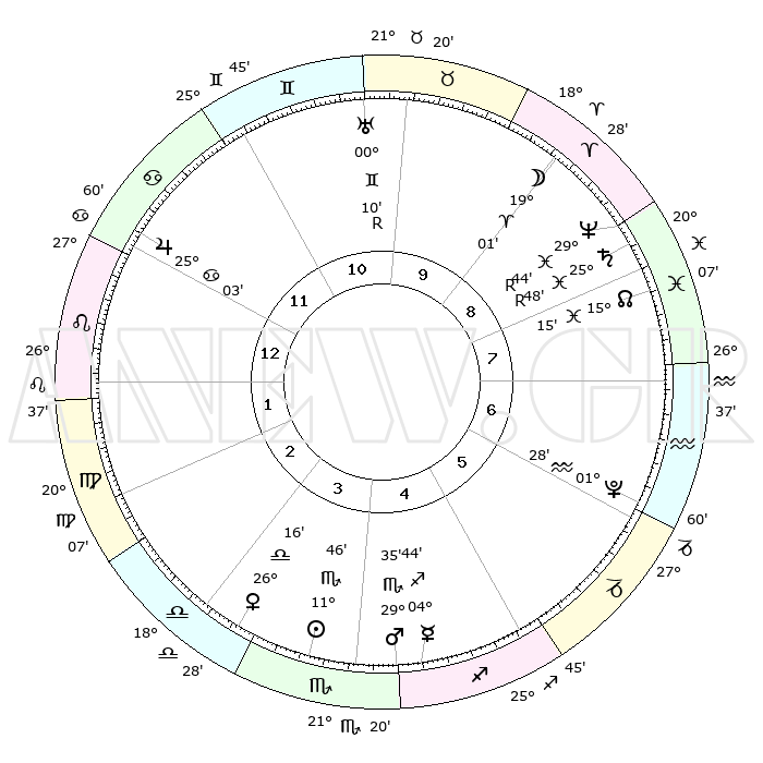 | | ΘΕΣΕΙΣ ΠΛΑΝΗΤΩΝ ΑΣΤΡΟΛΟΓΙΚΟΥ ΧΑΡΤΗ ΤΗΣ ΣΤΙΓΜΗΣ ΑΥΤΗΣ | | | | Πλανήτης | Ζώδιο | Μοίρες | Δεκαήμ. | Σε οίκο | Απόκλιση | | Ακμές των οίκων | | Ηλιος | Σκορπιός | 11°28' | Δεύτερο | 6 | 15 S 16 | | 1ος | 16°48' | Ταύρος | | Σελήνη | Κριός | 14°34' | Δεύτερο | 12 | 07 N 55 | | 2ος | 14°35' | Δίδυμοι | | Ερμής | Τοξότης | 04°32' | Πρώτο | 7 | 23 S 52 | | 3ος | 06°42' | Καρκίνος | | Αφροδίτη | Ζυγός | 25°53' | Τρίτο | 6 | 08 S 40 | | 4ος | 28°44' | Καρκίνος | | Αρης | Σκορπιός | 29°22' | Τρίτο | 7 | 20 S 25 | | 5ος | 25°08' | Λέων | | Δίας | Καρκίνος | 25°03' | Τρίτο | 3 | 21 N 12 | | 6ος | 01°12' | Ζυγός | | Κρόνος | Ιχθείς | 25°48'R | Τρίτο | 11 | 03 S 55 | | 7ος | 16°48' | Σκορπιός | | Ουρανός | Δίδυμοι | 00°10'R | Πρώτο | 1 | 19 N 59 | | 8ος | 14°35' | Τοξότης | | Ποσειδώνας | Ιχθείς | 29°44'R | Τρίτο | 11 | 01 S 22 | | 9ος | 06°42' | Αιγόκερως | | Πλούτωνας | Υδροχόος | 01°28' | Πρώτο | 10 | 23 S 30 | | 10ος | 28°44' | Αιγόκερως | | Β. Δεσμός | Ιχθείς | 15°16' | Δεύτερο | 11 | 05 S 48 | | 11ος | 25°08' | Υδροχόος | | Ωροσκόπος | Ταύρος | 16°48' | Δεύτερο | | | 12ος | 01°12' | Κριός | | Μεσουράνημα | Αιγόκερως | 28°44' | Τρίτο | | | |