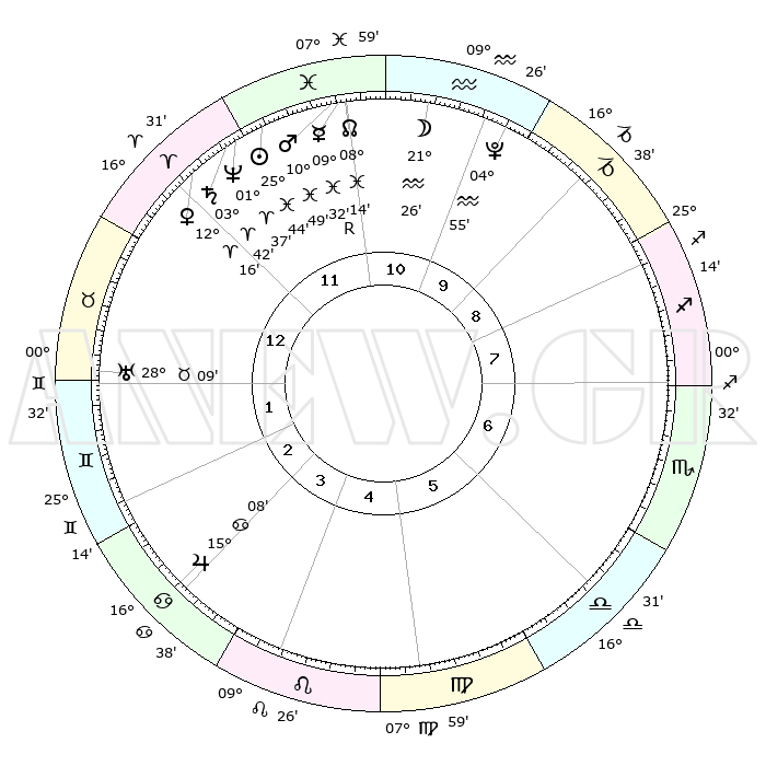 | | ΘΕΣΕΙΣ ΠΛΑΝΗΤΩΝ ΑΣΤΡΟΛΟΓΙΚΟΥ ΧΑΡΤΗ ΤΗΣ ΣΤΙΓΜΗΣ ΑΥΤΗΣ | | | | Πλανήτης | Ζώδιο | Μοίρες | Δεκαήμ. | Σε οίκο | Απόκλιση | | Ακμές των οίκων | | Ηλιος | Ιχθείς | 25°40' | Τρίτο | 12 | 01 S 43 | | 1ος | 29°04' | Κριός | | Σελήνη | Υδροχόος | 20°35' | Τρίτο | 11 | 16 S 12 | | 2ος | 01°33' | Δίδυμοι | | Ερμής | Ιχθείς | 09°34'R | Πρώτο | 11 | 06 S 01 | | 3ος | 25°12' | Δίδυμοι | | Αφροδίτη | Κριός | 12°11' | Δεύτερο | 12 | 03 N 53 | | 4ος | 16°53' | Καρκίνος | | Αρης | Ιχθείς | 10°46' | Δεύτερο | 11 | 08 S 32 | | 5ος | 11°12' | Λέων | | Δίας | Καρκίνος | 15°08' | Δεύτερο | 3 | 22 N 56 | | 6ος | 13°44' | Παρθένος | | Κρόνος | Κριός | 03°42' | Πρώτο | 12 | 00 S 29 | | 7ος | 29°04' | Ζυγός | | Ουρανός | Ταύρος | 28°09' | Τρίτο | 1 | 19 N 34 | | 8ος | 01°33' | Τοξότης | | Ποσειδώνας | Κριός | 01°37' | Πρώτο | 12 | 00 S 33 | | 9ος | 25°12' | Τοξότης | | Πλούτωνας | Υδροχόος | 04°55' | Πρώτο | 10 | 22 S 49 | | 10ος | 16°53' | Αιγόκερως | | Β. Δεσμός | Ιχθείς | 08°14' | Πρώτο | 11 | 08 S 29 | | 11ος | 11°12' | Υδροχόος | | Ωροσκόπος | Κριός | 29°04' | Τρίτο | | | 12ος | 13°44' | Ιχθείς | | Μεσουράνημα | Αιγόκερως | 16°53' | Δεύτερο | | | |