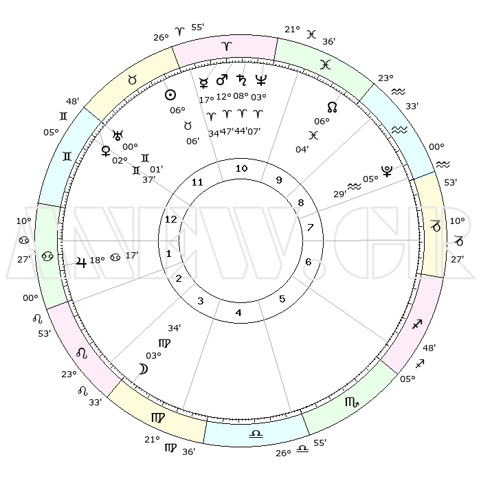 | | ΘΕΣΕΙΣ ΠΛΑΝΗΤΩΝ ΑΣΤΡΟΛΟΓΙΚΟΥ ΧΑΡΤΗ ΤΗΣ ΣΤΙΓΜΗΣ ΑΥΤΗΣ | | | | Πλανήτης | Ζώδιο | Μοίρες | Δεκαήμ. | Σε οίκο | Απόκλιση | | Ακμές των οίκων | | Ηλιος | Ταύρος | 06°03' | Πρώτο | 11 | 13 N 32 | | 1ος | 21°42' | Δίδυμοι | | Σελήνη | Παρθένος | 02°49' | Πρώτο | 4 | 10 N 50 | | 2ος | 13°10' | Καρκίνος | | Ερμής | Κριός | 17°28' | Δεύτερο | 11 | 04 N 41 | | 3ος | 04°33' | Λέων | | Αφροδίτη | Δίδυμοι | 02°33' | Πρώτο | 12 | 21 N 20 | | 4ος | 29°37' | Λέων | | Αρης | Κριός | 12°45' | Δεύτερο | 11 | 04 N 11 | | 5ος | 02°07' | Ζυγός | | Δίας | Καρκίνος | 18°17' | Δεύτερο | 2 | 22 N 34 | | 6ος | 12°25' | Σκορπιός | | Κρόνος | Κριός | 08°43' | Πρώτο | 11 | 01 N 28 | | 7ος | 21°42' | Τοξότης | | Ουρανός | Δίδυμοι | 00°01' | Πρώτο | 12 | 19 N 59 | | 8ος | 13°10' | Αιγόκερως | | Ποσειδώνας | Κριός | 03°07' | Πρώτο | 11 | 00 N 02 | | 9ος | 04°33' | Υδροχόος | | Πλούτωνας | Υδροχόος | 05°29' | Πρώτο | 9 | 22 S 48 | | 10ος | 29°37' | Υδροχόος | | Β. Δεσμός | Ιχθείς | 06°04' | Πρώτο | 10 | 09 S 17 | | 11ος | 02°07' | Κριός | | Ωροσκόπος | Δίδυμοι | 21°42' | Τρίτο | | | 12ος | 12°25' | Ταύρος | | Μεσουράνημα | Υδροχόος | 29°37' | Τρίτο | | | |