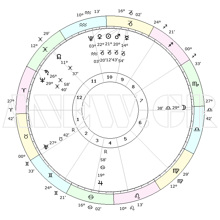 | | ΘΕΣΕΙΣ ΠΛΑΝΗΤΩΝ ΑΣΤΡΟΛΟΓΙΚΟΥ ΧΑΡΤΗ ΤΗΣ ΣΤΙΓΜΗΣ ΑΥΤΗΣ | | | | Πλανήτης | Ζώδιο | Μοίρες | Δεκαήμ. | Σε οίκο | Απόκλιση | | Ακμές των οίκων | | Ηλιος | Αιγόκερως | 20°50' | Τρίτο | 2 | 21 S 49 | | 1ος | 26°26' | Σκορπιός | | Σελήνη | Ζυγός | 25°23' | Τρίτο | 11 | 13 S 12 | | 2ος | 27°05' | Τοξότης | | Ερμής | Αιγόκερως | 14°20' | Δεύτερο | 2 | 24 S 10 | | 3ος | 02°13' | Υδροχόος | | Αφροδίτη | Αιγόκερως | 21°53' | Τρίτο | 2 | 22 S 30 | | 4ος | 08°09' | Ιχθείς | | Αρης | Αιγόκερως | 20°27' | Τρίτο | 2 | 22 S 49 | | 5ος | 09°36' | Κριός | | Δίας | Καρκίνος | 20°00'R | Τρίτο | 8 | 22 N 12 | | 6ος | 05°08' | Ταύρος | | Κρόνος | Ιχθείς | 26°57' | Τρίτο | 4 | 03 S 15 | | 7ος | 26°26' | Ταύρος | | Ουρανός | Ταύρος | 27°42'R | Τρίτο | 7 | 19 N 27 | | 8ος | 27°05' | Δίδυμοι | | Ποσειδώνας | Ιχθείς | 29°40' | Τρίτο | 4 | 01 S 21 | | 9ος | 02°13' | Λέων | | Πλούτωνας | Υδροχόος | 03°02' | Πρώτο | 3 | 23 S 09 | | 10ος | 08°09' | Παρθένος | | Β. Δεσμός | Ιχθείς | 11°38' | Δεύτερο | 4 | 07 S 12 | | 11ος | 09°36' | Ζυγός | | Ωροσκόπος | Σκορπιός | 26°26' | Τρίτο | | | 12ος | 05°08' | Σκορπιός | | Μεσουράνημα | Παρθένος | 08°09' | Πρώτο | | | |