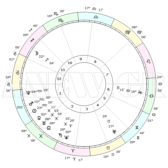 | | ΘΕΣΕΙΣ ΠΛΑΝΗΤΩΝ ΑΣΤΡΟΛΟΓΙΚΟΥ ΧΑΡΤΗ ΤΗΣ ΣΤΙΓΜΗΣ ΑΥΤΗΣ | | | | Πλανήτης | Ζώδιο | Μοίρες | Δεκαήμ. | Σε οίκο | Απόκλιση | | Ακμές των οίκων | | Ηλιος | Υδροχόος | 23°18' | Τρίτο | 3 | 13 S 45 | | 1ος | 10°06' | Τοξότης | | Σελήνη | Τοξότης | 20°29' | Τρίτο | 1 | 28 S 14 | | 2ος | 12°51' | Αιγόκερως | | Ερμής | Ιχθείς | 08°40' | Πρώτο | 3 | 08 S 50 | | 3ος | 20°15' | Υδροχόος | | Αφροδίτη | Ιχθείς | 02°01' | Πρώτο | 3 | 12 S 07 | | 4ος | 26°14' | Ιχθείς | | Αρης | Υδροχόος | 15°23' | Δεύτερο | 2 | 17 S 15 | | 5ος | 25°50' | Κριός | | Δίας | Καρκίνος | 16°16'R | Δεύτερο | 8 | 22 N 46 | | 6ος | 19°34' | Ταύρος | | Κρόνος | Ιχθείς | 29°54' | Τρίτο | 4 | 02 S 01 | | 7ος | 10°06' | Δίδυμοι | | Ουρανός | Ταύρος | 27°29' | Τρίτο | 6 | 19 N 25 | | 8ος | 12°51' | Καρκίνος | | Ποσειδώνας | Κριός | 00°28' | Πρώτο | 4 | 01 S 01 | | 9ος | 20°15' | Λέων | | Πλούτωνας | Υδροχόος | 04°03' | Πρώτο | 2 | 22 S 57 | | 10ος | 26°14' | Παρθένος | | Β. Δεσμός | Ιχθείς | 09°57' | Πρώτο | 3 | 07 S 50 | | 11ος | 25°50' | Ζυγός | | Ωροσκόπος | Τοξότης | 10°06' | Δεύτερο | | | 12ος | 19°34' | Σκορπιός | | Μεσουράνημα | Παρθένος | 26°14' | Τρίτο | | | |
