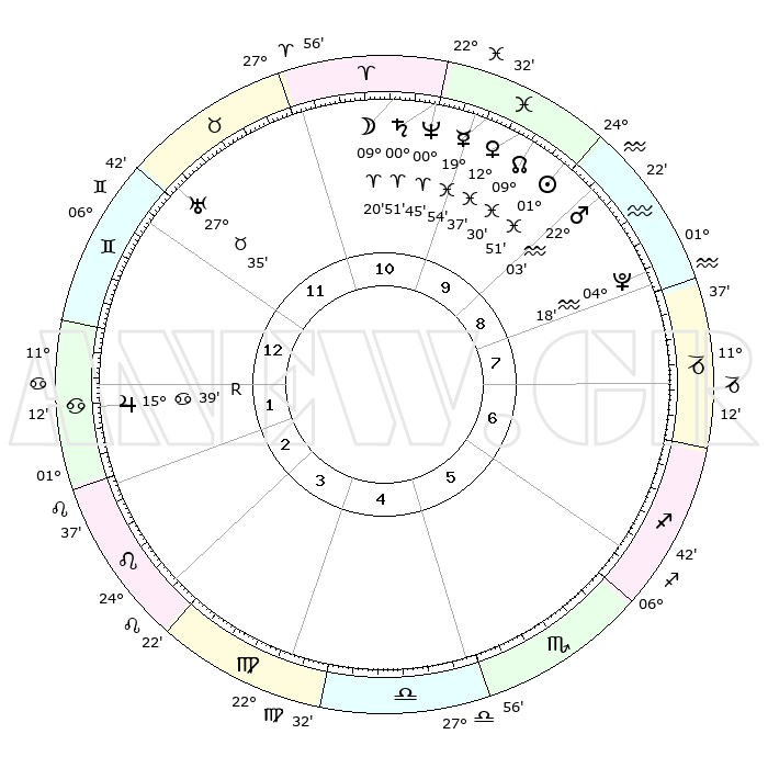 | | ΘΕΣΕΙΣ ΠΛΑΝΗΤΩΝ ΑΣΤΡΟΛΟΓΙΚΟΥ ΧΑΡΤΗ ΤΗΣ ΣΤΙΓΜΗΣ ΑΥΤΗΣ | | | | Πλανήτης | Ζώδιο | Μοίρες | Δεκαήμ. | Σε οίκο | Απόκλιση | | Ακμές των οίκων | | Ηλιος | Ιχθείς | 01°47' | Πρώτο | 10 | 10 S 50 | | 1ος | 15°48' | Δίδυμοι | | Σελήνη | Κριός | 08°18' | Πρώτο | 11 | 05 N 41 | | 2ος | 07°57' | Καρκίνος | | Ερμής | Ιχθείς | 19°50' | Δεύτερο | 10 | 02 S 47 | | 3ος | 29°11' | Καρκίνος | | Αφροδίτη | Ιχθείς | 12°31' | Δεύτερο | 10 | 08 S 12 | | 4ος | 23°30' | Λέων | | Αρης | Υδροχόος | 21°60' | Τρίτο | 9 | 15 S 12 | | 5ος | 24°53' | Παρθένος | | Δίας | Καρκίνος | 15°39'R | Δεύτερο | 2 | 22 N 51 | | 6ος | 05°02' | Σκορπιός | | Κρόνος | Κριός | 00°50' | Πρώτο | 11 | 01 S 38 | | 7ος | 15°48' | Τοξότης | | Ουρανός | Ταύρος | 27°35' | Τρίτο | 12 | 19 N 26 | | 8ος | 07°57' | Αιγόκερως | | Ποσειδώνας | Κριός | 00°45' | Πρώτο | 11 | 00 S 54 | | 9ος | 29°11' | Αιγόκερως | | Πλούτωνας | Υδροχόος | 04°18' | Πρώτο | 9 | 22 S 55 | | 10ος | 23°30' | Υδροχόος | | Β. Δεσμός | Ιχθείς | 09°30' | Πρώτο | 10 | 08 S 00 | | 11ος | 24°53' | Ιχθείς | | Ωροσκόπος | Δίδυμοι | 15°48' | Δεύτερο | | | 12ος | 05°02' | Ταύρος | | Μεσουράνημα | Υδροχόος | 23°30' | Τρίτο | | | |