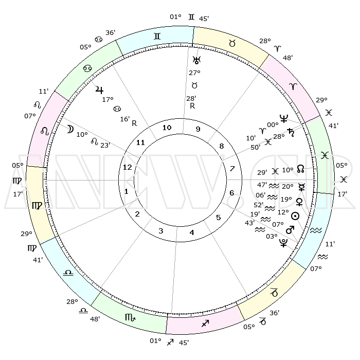 | | ΘΕΣΕΙΣ ΠΛΑΝΗΤΩΝ ΑΣΤΡΟΛΟΓΙΚΟΥ ΧΑΡΤΗ ΤΗΣ ΣΤΙΓΜΗΣ ΑΥΤΗΣ | | | | Πλανήτης | Ζώδιο | Μοίρες | Δεκαήμ. | Σε οίκο | Απόκλιση | | Ακμές των οίκων | | Ηλιος | Υδροχόος | 12°49' | Δεύτερο | 6 | 16 S 58 | | 1ος | 19°08' | Λέων | | Σελήνη | Λέων | 09°36' | Πρώτο | 12 | 20 N 20 | | 2ος | 11°52' | Παρθένος | | Ερμής | Υδροχόος | 20°41' | Τρίτο | 7 | 16 S 20 | | 3ος | 09°24' | Ζυγός | | Αφροδίτη | Υδροχόος | 19°02' | Δεύτερο | 6 | 16 S 25 | | 4ος | 12°02' | Σκορπιός | | Αρης | Υδροχόος | 07°16' | Πρώτο | 6 | 19 S 28 | | 5ος | 17°01' | Τοξότης | | Δίας | Καρκίνος | 17°17'R | Δεύτερο | 11 | 22 N 37 | | 6ος | 20°00' | Αιγόκερως | | Κρόνος | Ιχθείς | 28°49' | Τρίτο | 8 | 02 S 28 | | 7ος | 19°08' | Υδροχόος | | Ουρανός | Ταύρος | 27°28'R | Τρίτο | 10 | 19 N 24 | | 8ος | 11°52' | Ιχθείς | | Ποσειδώνας | Κριός | 00°10' | Πρώτο | 8 | 01 S 09 | | 9ος | 09°24' | Κριός | | Πλούτωνας | Υδροχόος | 03°43' | Πρώτο | 6 | 23 S 01 | | 10ος | 12°02' | Ταύρος | | Β. Δεσμός | Ιχθείς | 10°30' | Δεύτερο | 7 | 07 S 38 | | 11ος | 17°01' | Δίδυμοι | | Ωροσκόπος | Λέων | 19°08' | Δεύτερο | | | 12ος | 20°00' | Καρκίνος | | Μεσουράνημα | Ταύρος | 12°02' | Δεύτερο | | | |