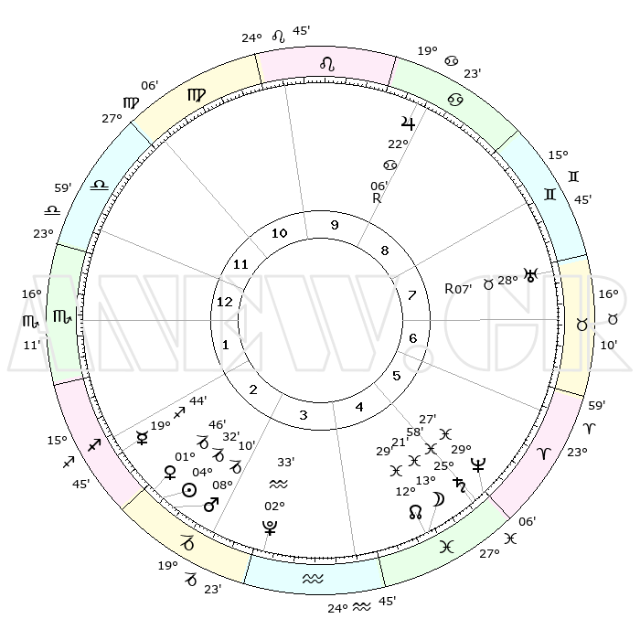 | | ΘΕΣΕΙΣ ΠΛΑΝΗΤΩΝ ΑΣΤΡΟΛΟΓΙΚΟΥ ΧΑΡΤΗ ΤΗΣ ΣΤΙΓΜΗΣ ΑΥΤΗΣ | | | | Πλανήτης | Ζώδιο | Μοίρες | Δεκαήμ. | Σε οίκο | Απόκλιση | | Ακμές των οίκων | | Ηλιος | Αιγόκερως | 04°27' | Πρώτο | 3 | 23 S 21 | | 1ος | 23°35' | Ζυγός | | Σελήνη | Ιχθείς | 12°20' | Δεύτερο | 5 | 06 S 51 | | 2ος | 21°38' | Σκορπιός | | Ερμής | Τοξότης | 19°38' | Δεύτερο | 2 | 22 S 54 | | 3ος | 23°08' | Τοξότης | | Αφροδίτη | Αιγόκερως | 01°40' | Πρώτο | 3 | 23 S 42 | | 4ος | 26°55' | Αιγόκερως | | Αρης | Αιγόκερως | 08°07' | Πρώτο | 3 | 24 S 02 | | 5ος | 29°52' | Υδροχόος | | Δίας | Καρκίνος | 22°07'R | Τρίτο | 9 | 21 N 50 | | 6ος | 29°04' | Ιχθείς | | Κρόνος | Ιχθείς | 25°58' | Τρίτο | 5 | 03 S 42 | | 7ος | 23°35' | Κριός | | Ουρανός | Ταύρος | 28°07'R | Τρίτο | 8 | 19 N 32 | | 8ος | 21°38' | Ταύρος | | Ποσειδώνας | Ιχθείς | 29°27' | Τρίτο | 6 | 01 S 27 | | 9ος | 23°08' | Δίδυμοι | | Πλούτωνας | Υδροχόος | 02°33' | Πρώτο | 4 | 23 S 15 | | 10ος | 26°55' | Καρκίνος | | Β. Δεσμός | Ιχθείς | 12°29' | Δεύτερο | 5 | 06 S 52 | | 11ος | 29°52' | Λέων | | Ωροσκόπος | Ζυγός | 23°35' | Τρίτο | | | 12ος | 29°04' | Παρθένος | | Μεσουράνημα | Καρκίνος | 26°55' | Τρίτο | | | |