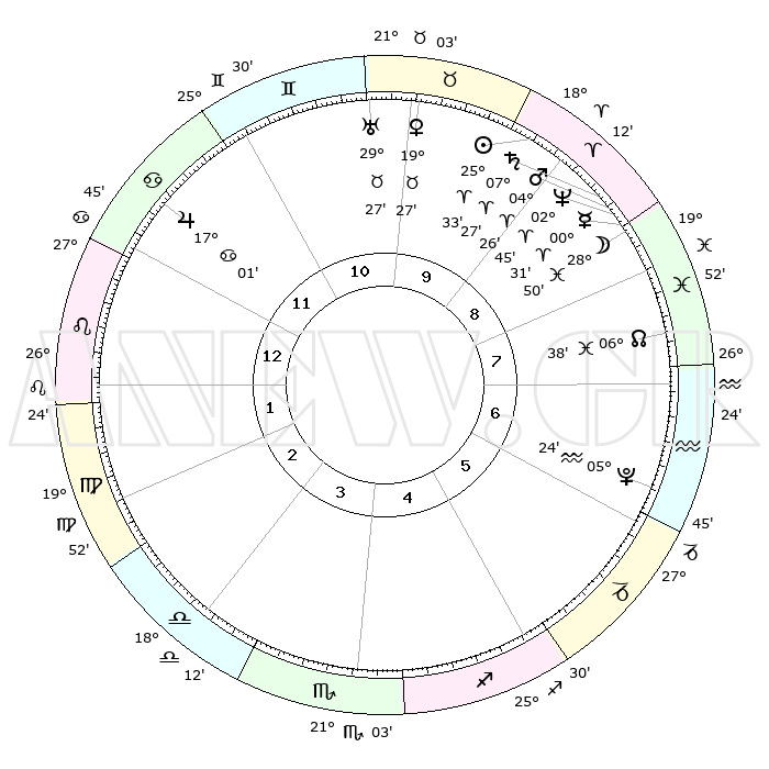 | | ΘΕΣΕΙΣ ΠΛΑΝΗΤΩΝ ΑΣΤΡΟΛΟΓΙΚΟΥ ΧΑΡΤΗ ΤΗΣ ΣΤΙΓΜΗΣ ΑΥΤΗΣ | | | | Πλανήτης | Ζώδιο | Μοίρες | Δεκαήμ. | Σε οίκο | Απόκλιση | | Ακμές των οίκων | | Ηλιος | Κριός | 25°28' | Τρίτο | 10 | 09 N 51 | | 1ος | 04°15' | Λέων | | Σελήνη | Ιχθείς | 27°46' | Τρίτο | 9 | 00 N 42 | | 2ος | 25°36' | Λέων | | Ερμής | Κριός | 00°25' | Πρώτο | 9 | 02 S 13 | | 3ος | 21°14' | Παρθένος | | Αφροδίτη | Ταύρος | 19°21' | Δεύτερο | 10 | 17 N 45 | | 4ος | 22°45' | Ζυγός | | Αρης | Κριός | 04°22' | Πρώτο | 9 | 00 N 50 | | 5ος | 28°40' | Σκορπιός | | Δίας | Καρκίνος | 17°01' | Δεύτερο | 12 | 22 N 44 | | 6ος | 03°41' | Αιγόκερως | | Κρόνος | Κριός | 07°26' | Πρώτο | 9 | 00 N 59 | | 7ος | 04°15' | Υδροχόος | | Ουρανός | Ταύρος | 29°27' | Τρίτο | 11 | 19 N 52 | | 8ος | 25°36' | Υδροχόος | | Ποσειδώνας | Κριός | 02°44' | Πρώτο | 9 | 00 S 07 | | 9ος | 21°14' | Ιχθείς | | Πλούτωνας | Υδροχόος | 05°24' | Πρώτο | 7 | 22 S 47 | | 10ος | 22°45' | Κριός | | Β. Δεσμός | Ιχθείς | 06°38' | Πρώτο | 8 | 09 S 04 | | 11ος | 28°40' | Ταύρος | | Ωροσκόπος | Λέων | 04°15' | Πρώτο | | | 12ος | 03°41' | Καρκίνος | | Μεσουράνημα | Κριός | 22°45' | Τρίτο | | | |