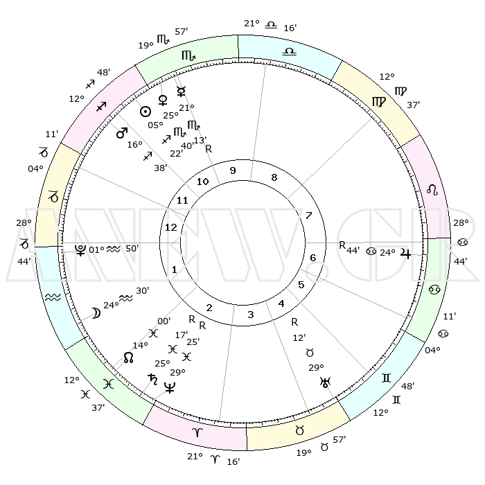 | | ΘΕΣΕΙΣ ΠΛΑΝΗΤΩΝ ΑΣΤΡΟΛΟΓΙΚΟΥ ΧΑΡΤΗ ΤΗΣ ΣΤΙΓΜΗΣ ΑΥΤΗΣ | | | | Πλανήτης | Ζώδιο | Μοίρες | Δεκαήμ. | Σε οίκο | Απόκλιση | | Ακμές των οίκων | | Ηλιος | Τοξότης | 05°21' | Πρώτο | 11 | 21 S 11 | | 1ος | 16°19' | Αιγόκερως | | Σελήνη | Υδροχόος | 24°06' | Τρίτο | 1 | 15 S 08 | | 2ος | 27°35' | Υδροχόος | | Ερμής | Σκορπιός | 21°14'R | Τρίτο | 10 | 15 S 50 | | 3ος | 07°37' | Κριός | | Αφροδίτη | Σκορπιός | 25°37' | Τρίτο | 10 | 18 S 21 | | 4ος | 08°36' | Ταύρος | | Αρης | Τοξότης | 16°36' | Δεύτερο | 11 | 23 S 23 | | 5ος | 02°39' | Δίδυμοι | | Δίας | Καρκίνος | 24°45'R | Τρίτο | 7 | 21 N 19 | | 6ος | 23°52' | Δίδυμοι | | Κρόνος | Ιχθείς | 25°17'R | Τρίτο | 2 | 04 S 04 | | 7ος | 16°19' | Καρκίνος | | Ουρανός | Ταύρος | 29°12'R | Τρίτο | 4 | 19 N 46 | | 8ος | 27°35' | Λέων | | Ποσειδώνας | Ιχθείς | 29°25'R | Τρίτο | 2 | 01 S 28 | | 9ος | 07°37' | Ζυγός | | Πλούτωνας | Υδροχόος | 01°50' | Πρώτο | 1 | 23 S 25 | | 10ος | 08°36' | Σκορπιός | | Β. Δεσμός | Ιχθείς | 14°00' | Δεύτερο | 2 | 06 S 17 | | 11ος | 02°39' | Τοξότης | | Ωροσκόπος | Αιγόκερως | 16°19' | Δεύτερο | | | 12ος | 23°52' | Τοξότης | | Μεσουράνημα | Σκορπιός | 08°36' | Πρώτο | | | |