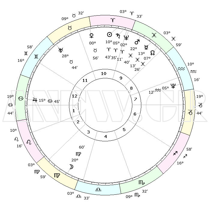 | | ΘΕΣΕΙΣ ΠΛΑΝΗΤΩΝ ΑΣΤΡΟΛΟΓΙΚΟΥ ΧΑΡΤΗ ΤΗΣ ΣΤΙΓΜΗΣ ΑΥΤΗΣ | | | | Πλανήτης | Ζώδιο | Μοίρες | Δεκαήμ. | Σε οίκο | Απόκλιση | | Ακμές των οίκων | | Ηλιος | Κριός | 10°39' | Δεύτερο | 10 | 04 N 13 | | 1ος | 29°42' | Δίδυμοι | | Σελήνη | Παρθένος | 20°10' | Τρίτο | 4 | 02 N 57 | | 2ος | 20°31' | Καρκίνος | | Ερμής | Ιχθείς | 13°10' | Δεύτερο | 10 | 07 S 43 | | 3ος | 12°18' | Λέων | | Αφροδίτη | Ταύρος | 00°51' | Πρώτο | 11 | 11 N 20 | | 4ος | 08°34' | Παρθένος | | Αρης | Ιχθείς | 22°37' | Τρίτο | 10 | 03 S 53 | | 5ος | 12°28' | Ζυγός | | Δίας | Καρκίνος | 15°44' | Δεύτερο | 1 | 22 N 52 | | 6ος | 22°29' | Σκορπιός | | Κρόνος | Κριός | 05°35' | Πρώτο | 10 | 00 N 16 | | 7ος | 29°42' | Τοξότης | | Ουρανός | Ταύρος | 28°44' | Τρίτο | 12 | 19 N 42 | | 8ος | 20°31' | Αιγόκερως | | Ποσειδώνας | Κριός | 02°11' | Πρώτο | 10 | 00 S 20 | | 9ος | 12°18' | Υδροχόος | | Πλούτωνας | Υδροχόος | 05°12' | Πρώτο | 8 | 22 S 47 | | 10ος | 08°34' | Ιχθείς | | Β. Δεσμός | Ιχθείς | 07°26' | Πρώτο | 9 | 08 S 47 | | 11ος | 12°28' | Κριός | | Ωροσκόπος | Δίδυμοι | 29°42' | Τρίτο | | | 12ος | 22°29' | Ταύρος | | Μεσουράνημα | Ιχθείς | 08°34' | Πρώτο | | | |