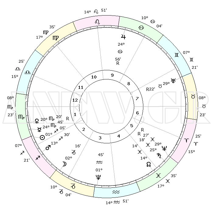 | | ΘΕΣΕΙΣ ΠΛΑΝΗΤΩΝ ΑΣΤΡΟΛΟΓΙΚΟΥ ΧΑΡΤΗ ΤΗΣ ΣΤΙΓΜΗΣ ΑΥΤΗΣ | | | | Πλανήτης | Ζώδιο | Μοίρες | Δεκαήμ. | Σε οίκο | Απόκλιση | | Ακμές των οίκων | | Ηλιος | Τοξότης | 01°01' | Πρώτο | 2 | 20 S 21 | | 1ος | 18°46' | Ζυγός | | Σελήνη | Αιγόκερως | 01°27' | Πρώτο | 3 | 28 S 13 | | 2ος | 16°32' | Σκορπιός | | Ερμής | Σκορπιός | 24°50'R | Τρίτο | 2 | 17 S 37 | | 3ος | 17°45' | Τοξότης | | Αφροδίτη | Σκορπιός | 20°15' | Τρίτο | 2 | 16 S 52 | | 4ος | 21°17' | Αιγόκερως | | Αρης | Τοξότης | 13°27' | Δεύτερο | 2 | 23 S 00 | | 5ος | 24°14' | Υδροχόος | | Δίας | Καρκίνος | 24°56'R | Τρίτο | 10 | 21 N 16 | | 6ος | 23°46' | Ιχθείς | | Κρόνος | Ιχθείς | 25°18'R | Τρίτο | 6 | 04 S 04 | | 7ος | 18°46' | Κριός | | Ουρανός | Ταύρος | 29°22'R | Τρίτο | 8 | 19 N 49 | | 8ος | 16°32' | Ταύρος | | Ποσειδώνας | Ιχθείς | 29°27'R | Τρίτο | 6 | 01 S 28 | | 9ος | 17°45' | Δίδυμοι | | Πλούτωνας | Υδροχόος | 01°45' | Πρώτο | 4 | 23 S 26 | | 10ος | 21°17' | Καρκίνος | | Β. Δεσμός | Ιχθείς | 14°14' | Δεύτερο | 5 | 06 S 12 | | 11ος | 24°14' | Λέων | | Ωροσκόπος | Ζυγός | 18°46' | Δεύτερο | | | 12ος | 23°46' | Παρθένος | | Μεσουράνημα | Καρκίνος | 21°17' | Τρίτο | | | |