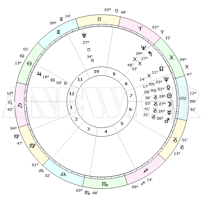 | | ΘΕΣΕΙΣ ΠΛΑΝΗΤΩΝ ΑΣΤΡΟΛΟΓΙΚΟΥ ΧΑΡΤΗ ΤΗΣ ΣΤΙΓΜΗΣ ΑΥΤΗΣ | | | | Πλανήτης | Ζώδιο | Μοίρες | Δεκαήμ. | Σε οίκο | Απόκλιση | | Ακμές των οίκων | | Ηλιος | Αιγόκερως | 28°32' | Τρίτο | 7 | 20 S 27 | | 1ος | 25°18' | Καρκίνος | | Σελήνη | Αιγόκερως | 26°19' | Τρίτο | 7 | 24 S 21 | | 2ος | 16°03' | Λέων | | Ερμής | Αιγόκερως | 26°35' | Τρίτο | 7 | 22 S 45 | | 3ος | 10°28' | Παρθένος | | Αφροδίτη | Υδροχόος | 01°24' | Πρώτο | 7 | 20 S 54 | | 4ος | 10°53' | Ζυγός | | Αρης | Αιγόκερως | 26°19' | Τρίτο | 7 | 21 S 51 | | 5ος | 16°59' | Σκορπιός | | Δίας | Καρκίνος | 18°60'R | Δεύτερο | 12 | 22 N 22 | | 6ος | 23°28' | Τοξότης | | Κρόνος | Ιχθείς | 27°32' | Τρίτο | 9 | 03 S 00 | | 7ος | 25°18' | Αιγόκερως | | Ουρανός | Ταύρος | 27°34'R | Τρίτο | 11 | 19 N 26 | | 8ος | 16°03' | Υδροχόος | | Ποσειδώνας | Ιχθείς | 29°49' | Τρίτο | 9 | 01 S 17 | | 9ος | 10°29' | Ιχθείς | | Πλούτωνας | Υδροχόος | 03°16' | Πρώτο | 7 | 23 S 06 | | 10ος | 10°53' | Κριός | | Β. Δεσμός | Ιχθείς | 11°14' | Δεύτερο | 9 | 07 S 21 | | 11ος | 16°59' | Ταύρος | | Ωροσκόπος | Καρκίνος | 25°18' | Τρίτο | | | 12ος | 23°28' | Δίδυμοι | | Μεσουράνημα | Κριός | 10°53' | Δεύτερο | | | |