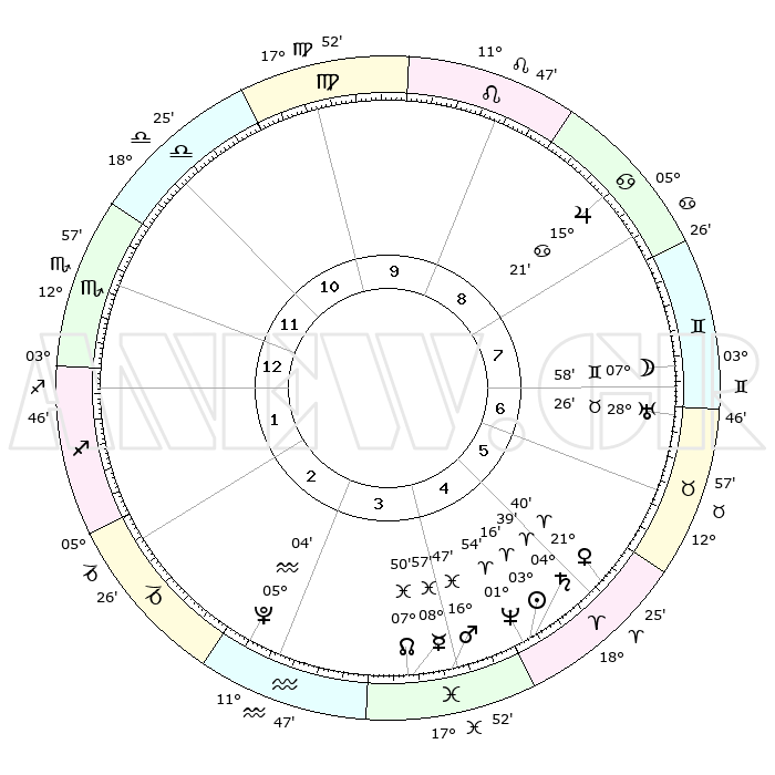 | | ΘΕΣΕΙΣ ΠΛΑΝΗΤΩΝ ΑΣΤΡΟΛΟΓΙΚΟΥ ΧΑΡΤΗ ΤΗΣ ΣΤΙΓΜΗΣ ΑΥΤΗΣ | | | | Πλανήτης | Ζώδιο | Μοίρες | Δεκαήμ. | Σε οίκο | Απόκλιση | | Ακμές των οίκων | | Ηλιος | Κριός | 03°12' | Πρώτο | 5 | 01 N 16 | | 1ος | 15°22' | Σκορπιός | | Σελήνη | Δίδυμοι | 07°04' | Πρώτο | 7 | 26 N 38 | | 2ος | 14°53' | Τοξότης | | Ερμής | Ιχθείς | 08°56' | Πρώτο | 4 | 07 S 58 | | 3ος | 18°25' | Αιγόκερως | | Αφροδίτη | Κριός | 21°35' | Τρίτο | 5 | 07 N 42 | | 4ος | 23°43' | Υδροχόος | | Αρης | Ιχθείς | 16°44' | Δεύτερο | 4 | 06 S 13 | | 5ος | 26°07' | Ιχθείς | | Δίας | Καρκίνος | 15°21' | Δεύτερο | 8 | 22 N 55 | | 6ος | 23°06' | Κριός | | Κρόνος | Κριός | 04°39' | Πρώτο | 5 | 00 S 06 | | 7ος | 15°22' | Ταύρος | | Ουρανός | Ταύρος | 28°26' | Τρίτο | 7 | 19 N 38 | | 8ος | 14°53' | Δίδυμοι | | Ποσειδώνας | Κριός | 01°54' | Πρώτο | 5 | 00 S 27 | | 9ος | 18°25' | Καρκίνος | | Πλούτωνας | Υδροχόος | 05°04' | Πρώτο | 3 | 22 S 48 | | 10ος | 23°43' | Λέων | | Β. Δεσμός | Ιχθείς | 07°50' | Πρώτο | 4 | 08 S 38 | | 11ος | 26°07' | Παρθένος | | Ωροσκόπος | Σκορπιός | 15°22' | Δεύτερο | | | 12ος | 23°06' | Ζυγός | | Μεσουράνημα | Λέων | 23°43' | Τρίτο | | | |