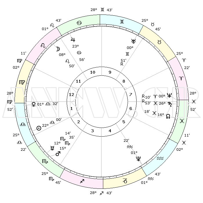 | ΘΕΣΕΙΣ ΠΛΑΝΗΤΩΝ ΑΣΤΡΟΛΟΓΙΚΟΥ ΧΑΡΤΗ ΤΗΣ ΣΤΙΓΜΗΣ ΑΥΤΗΣ | | Πλανήτης | Ζώδιο | Μοίρες | Δεκαήμ. | Σε οίκο | Απόκλιση | | Ακμές των οίκων | Ηλιος | Ζυγός | 21°49' | Τρίτο | 4 | 08 S 30 | | 1ος | 01°07' | Λέων | Σελήνη | Λέων | 06°13' | Πρώτο | 1 | 22 N 05 | | 2ος | 22°14' | Λέων | Ερμής | Σκορπιός | 11°57' | Δεύτερο | 4 | 17 S 03 | | 3ος | 17°26' | Παρθένος | Αφροδίτη | Ζυγός | 01°17' | Πρώτο | 3 | 00 N 53 | | 4ος | 18°36' | Ζυγός | Αρης | Σκορπιός | 15°27' | Δεύτερο | 4 | 16 S 41 | | 5ος | 24°37' | Σκορπιός | Δίας | Καρκίνος | 23°55' | Τρίτο | 12 | 21 N 22 | | 6ος | 00°08' | Αιγόκερως | Κρόνος | Ιχθείς | 26°54'R | Τρίτο | 9 | 03 S 32 | | 7ος | 01°07' | Υδροχόος | Ουρανός | Δίδυμοι | 00°51'R | Πρώτο | 11 | 20 N 07 | | 8ος | 22°14' | Υδροχόος | Ποσειδώνας | Κριός | 00°11'R | Πρώτο | 9 | 01 S 11 | | 9ος | 17°26' | Ιχθείς | Πλούτωνας | Υδροχόος | 01°22' | Πρώτο | 7 | 23 S 32 | | 10ος | 18°36' | Κριός | Β. Δεσμός | Ιχθείς | 16°18' | Δεύτερο | 8 | 05 S 24 | | 11ος | 24°37' | Ταύρος | Ωροσκόπος | Λέων | 01°07' | Πρώτο | | | 12ος | 00°08' | Καρκίνος | Μεσουράνημα | Κριός | 18°36' | Δεύτερο | | | |