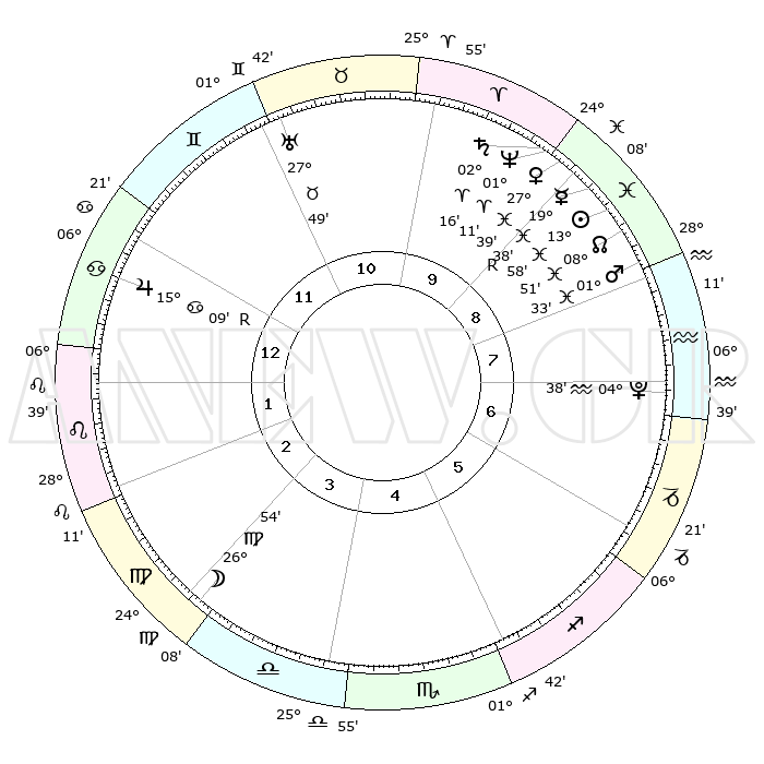 | | ΘΕΣΕΙΣ ΠΛΑΝΗΤΩΝ ΑΣΤΡΟΛΟΓΙΚΟΥ ΧΑΡΤΗ ΤΗΣ ΣΤΙΓΜΗΣ ΑΥΤΗΣ | | | | Πλανήτης | Ζώδιο | Μοίρες | Δεκαήμ. | Σε οίκο | Απόκλιση | | Ακμές των οίκων | | Ηλιος | Ιχθείς | 13°55' | Δεύτερο | 9 | 06 S 19 | | 1ος | 20°57' | Καρκίνος | | Σελήνη | Παρθένος | 26°13' | Τρίτο | 3 | 00 N 04 | | 2ος | 11°31' | Λέων | | Ερμής | Ιχθείς | 19°41'R | Δεύτερο | 9 | 00 S 43 | | 3ος | 05°23' | Παρθένος | | Αφροδίτη | Ιχθείς | 27°35' | Τρίτο | 9 | 02 S 09 | | 4ος | 05°09' | Ζυγός | | Αρης | Ιχθείς | 01°30' | Πρώτο | 8 | 11 S 57 | | 5ος | 11°10' | Σκορπιός | | Δίας | Καρκίνος | 15°09'R | Δεύτερο | 12 | 22 N 55 | | 6ος | 18°24' | Τοξότης | | Κρόνος | Κριός | 02°15' | Πρώτο | 9 | 01 S 03 | | 7ος | 20°57' | Αιγόκερως | | Ουρανός | Ταύρος | 27°49' | Τρίτο | 11 | 19 N 30 | | 8ος | 11°31' | Υδροχόος | | Ποσειδώνας | Κριός | 01°11' | Πρώτο | 9 | 00 S 44 | | 9ος | 05°23' | Ιχθείς | | Πλούτωνας | Υδροχόος | 04°38' | Πρώτο | 7 | 22 S 52 | | 10ος | 05°09' | Κριός | | Β. Δεσμός | Ιχθείς | 08°52' | Πρώτο | 9 | 08 S 15 | | 11ος | 11°10' | Ταύρος | | Ωροσκόπος | Καρκίνος | 20°57' | Τρίτο | | | 12ος | 18°24' | Δίδυμοι | | Μεσουράνημα | Κριός | 05°09' | Πρώτο | | | |