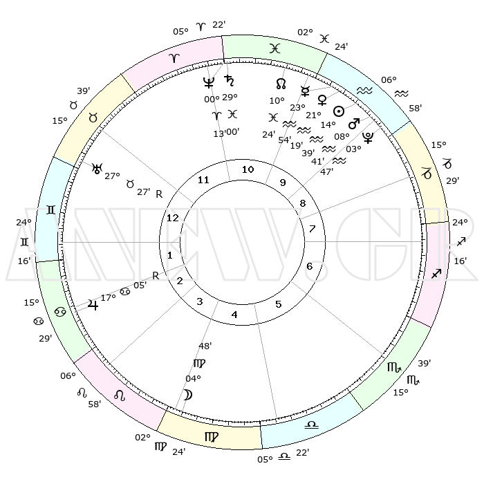 | | ΘΕΣΕΙΣ ΠΛΑΝΗΤΩΝ ΑΣΤΡΟΛΟΓΙΚΟΥ ΧΑΡΤΗ ΤΗΣ ΣΤΙΓΜΗΣ ΑΥΤΗΣ | | | | Πλανήτης | Ζώδιο | Μοίρες | Δεκαήμ. | Σε οίκο | Απόκλιση | | Ακμές των οίκων | | Ηλιος | Υδροχόος | 14°36' | Δεύτερο | 10 | 16 S 27 | | 1ος | 01°21' | Δίδυμοι | | Σελήνη | Παρθένος | 03°59' | Πρώτο | 4 | 10 N 29 | | 2ος | 25°53' | Δίδυμοι | | Ερμής | Υδροχόος | 23°47' | Τρίτο | 10 | 15 S 12 | | 3ος | 17°16' | Καρκίνος | | Αφροδίτη | Υδροχόος | 21°14' | Τρίτο | 10 | 15 S 44 | | 4ος | 10°08' | Λέων | | Αρης | Υδροχόος | 08°38' | Πρώτο | 9 | 19 S 07 | | 5ος | 08°50' | Παρθένος | | Δίας | Καρκίνος | 17°05'R | Δεύτερο | 2 | 22 N 39 | | 6ος | 17°29' | Ζυγός | | Κρόνος | Ιχθείς | 28°60' | Τρίτο | 11 | 02 S 23 | | 7ος | 01°21' | Τοξότης | | Ουρανός | Ταύρος | 27°27'R | Τρίτο | 12 | 19 N 24 | | 8ος | 25°53' | Τοξότης | | Ποσειδώνας | Κριός | 00°13' | Πρώτο | 11 | 01 S 07 | | 9ος | 17°16' | Αιγόκερως | | Πλούτωνας | Υδροχόος | 03°47' | Πρώτο | 9 | 23 S 00 | | 10ος | 10°08' | Υδροχόος | | Β. Δεσμός | Ιχθείς | 10°24' | Δεύτερο | 11 | 07 S 40 | | 11ος | 08°50' | Ιχθείς | | Ωροσκόπος | Δίδυμοι | 01°21' | Πρώτο | | | 12ος | 17°29' | Κριός | | Μεσουράνημα | Υδροχόος | 10°08' | Δεύτερο | | | |