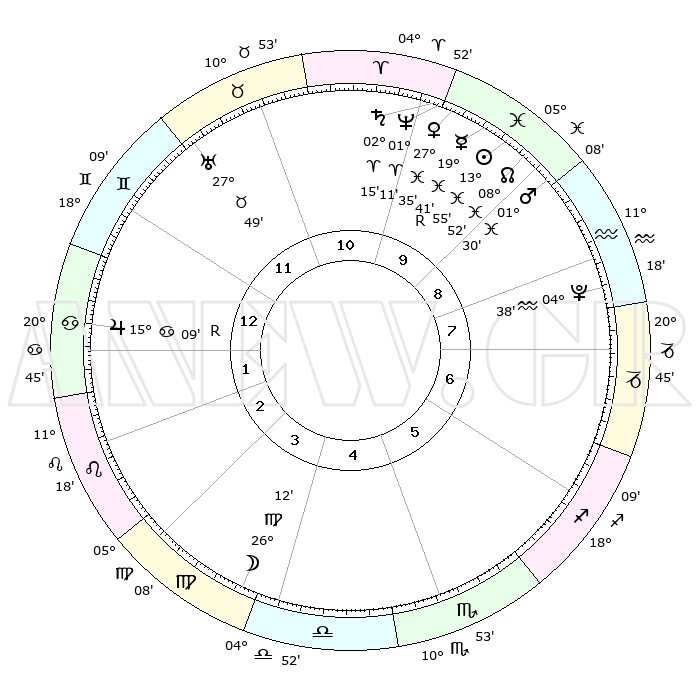 | | ΘΕΣΕΙΣ ΠΛΑΝΗΤΩΝ ΑΣΤΡΟΛΟΓΙΚΟΥ ΧΑΡΤΗ ΤΗΣ ΣΤΙΓΜΗΣ ΑΥΤΗΣ | | | | Πλανήτης | Ζώδιο | Μοίρες | Δεκαήμ. | Σε οίκο | Απόκλιση | | Ακμές των οίκων | | Ηλιος | Ιχθείς | 13°51' | Δεύτερο | 10 | 06 S 21 | | 1ος | 01°17' | Καρκίνος | | Σελήνη | Παρθένος | 25°23' | Τρίτο | 4 | 00 N 28 | | 2ος | 21°60' | Καρκίνος | | Ερμής | Ιχθείς | 19°44'R | Δεύτερο | 10 | 00 S 42 | | 3ος | 13°53' | Λέων | | Αφροδίτη | Ιχθείς | 27°30' | Τρίτο | 10 | 02 S 11 | | 4ος | 10°24' | Παρθένος | | Αρης | Ιχθείς | 01°27' | Πρώτο | 9 | 11 S 59 | | 5ος | 14°32' | Ζυγός | | Δίας | Καρκίνος | 15°10'R | Δεύτερο | 1 | 22 N 55 | | 6ος | 24°27' | Σκορπιός | | Κρόνος | Κριός | 02°15' | Πρώτο | 10 | 01 S 04 | | 7ος | 01°16' | Αιγόκερως | | Ουρανός | Ταύρος | 27°49' | Τρίτο | 12 | 19 N 30 | | 8ος | 21°60' | Αιγόκερως | | Ποσειδώνας | Κριός | 01°10' | Πρώτο | 10 | 00 S 44 | | 9ος | 13°53' | Υδροχόος | | Πλούτωνας | Υδροχόος | 04°38' | Πρώτο | 8 | 22 S 52 | | 10ος | 10°24' | Ιχθείς | | Β. Δεσμός | Ιχθείς | 08°52' | Πρώτο | 9 | 08 S 15 | | 11ος | 14°32' | Κριός | | Ωροσκόπος | Καρκίνος | 01°17' | Πρώτο | | | 12ος | 24°27' | Ταύρος | | Μεσουράνημα | Ιχθείς | 10°24' | Δεύτερο | | | |