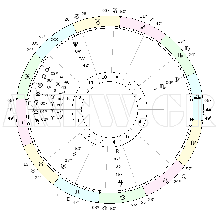| | ΘΕΣΕΙΣ ΠΛΑΝΗΤΩΝ ΑΣΤΡΟΛΟΓΙΚΟΥ ΧΑΡΤΗ ΤΗΣ ΣΤΙΓΜΗΣ ΑΥΤΗΣ | | | | Πλανήτης | Ζώδιο | Μοίρες | Δεκαήμ. | Σε οίκο | Απόκλιση | | Ακμές των οίκων | | Ηλιος | Ιχθείς | 16°35' | Δεύτερο | 1 | 05 S 18 | | 1ος | 22°23' | Υδροχόος | | Σελήνη | Ζυγός | 29°54' | Τρίτο | 8 | 15 S 16 | | 2ος | 08°11' | Κριός | | Ερμής | Ιχθείς | 17°11'R | Δεύτερο | 1 | 01 S 42 | | 3ος | 12°25' | Ταύρος | | Αφροδίτη | Κριός | 00°54' | Πρώτο | 1 | 00 S 47 | | 4ος | 07°38' | Δίδυμοι | | Αρης | Ιχθείς | 03°36' | Πρώτο | 1 | 11 S 12 | | 5ος | 29°24' | Δίδυμοι | | Δίας | Καρκίνος | 15°07'R | Δεύτερο | 5 | 22 N 56 | | 6ος | 22°14' | Καρκίνος | | Κρόνος | Κριός | 02°35' | Πρώτο | 1 | 00 S 56 | | 7ος | 22°23' | Λέων | | Ουρανός | Ταύρος | 27°53' | Τρίτο | 3 | 19 N 31 | | 8ος | 08°11' | Ζυγός | | Ποσειδώνας | Κριός | 01°16' | Πρώτο | 1 | 00 S 42 | | 9ος | 12°25' | Σκορπιός | | Πλούτωνας | Υδροχόος | 04°42' | Πρώτο | 12 | 22 S 51 | | 10ος | 07°38' | Τοξότης | | Β. Δεσμός | Ιχθείς | 08°43' | Πρώτο | 1 | 08 S 18 | | 11ος | 29°24' | Τοξότης | | Ωροσκόπος | Υδροχόος | 22°23' | Τρίτο | | | 12ος | 22°14' | Αιγόκερως | | Μεσουράνημα | Τοξότης | 07°38' | Πρώτο | | | |
