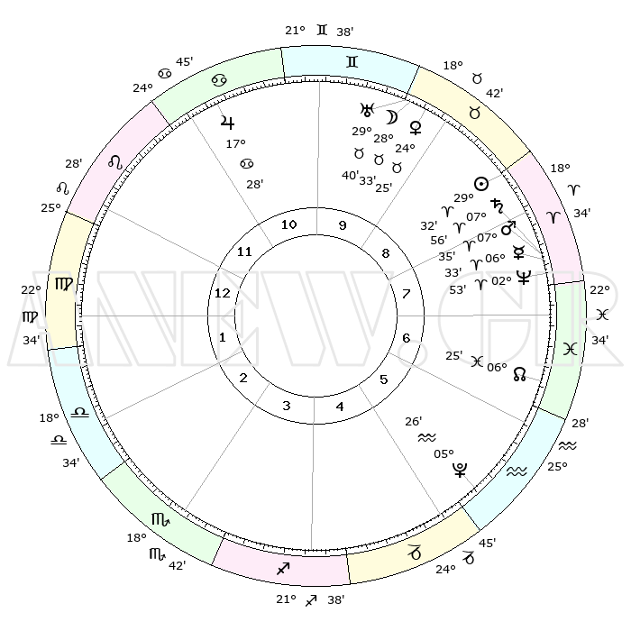 | | ΘΕΣΕΙΣ ΠΛΑΝΗΤΩΝ ΑΣΤΡΟΛΟΓΙΚΟΥ ΧΑΡΤΗ ΤΗΣ ΣΤΙΓΜΗΣ ΑΥΤΗΣ | | | | Πλανήτης | Ζώδιο | Μοίρες | Δεκαήμ. | Σε οίκο | Απόκλιση | | Ακμές των οίκων | | Ηλιος | Κριός | 29°28' | Τρίτο | 9 | 11 N 17 | | 1ος | 03°00' | Παρθένος | | Σελήνη | Ταύρος | 27°33' | Τρίτο | 9 | 24 N 30 | | 2ος | 27°10' | Παρθένος | | Ερμής | Κριός | 06°27' | Πρώτο | 8 | 00 N 09 | | 3ος | 26°06' | Ζυγός | | Αφροδίτη | Ταύρος | 24°21' | Τρίτο | 9 | 19 N 13 | | 4ος | 29°03' | Σκορπιός | | Αρης | Κριός | 07°32' | Πρώτο | 8 | 02 N 07 | | 5ος | 03°02' | Αιγόκερως | | Δίας | Καρκίνος | 17°27' | Δεύτερο | 11 | 22 N 40 | | 6ος | 04°46' | Υδροχόος | | Κρόνος | Κριός | 07°56' | Πρώτο | 8 | 01 N 10 | | 7ος | 03°00' | Ιχθείς | | Ουρανός | Ταύρος | 29°39' | Τρίτο | 10 | 19 N 55 | | 8ος | 27°10' | Ιχθείς | | Ποσειδώνας | Κριός | 02°53' | Πρώτο | 8 | 00 S 04 | | 9ος | 26°06' | Κριός | | Πλούτωνας | Υδροχόος | 05°26' | Πρώτο | 6 | 22 S 48 | | 10ος | 29°03' | Ταύρος | | Β. Δεσμός | Ιχθείς | 06°25' | Πρώτο | 7 | 09 S 09 | | 11ος | 03°02' | Καρκίνος | | Ωροσκόπος | Παρθένος | 03°00' | Πρώτο | | | 12ος | 04°46' | Λέων | | Μεσουράνημα | Ταύρος | 29°03' | Τρίτο | | | |