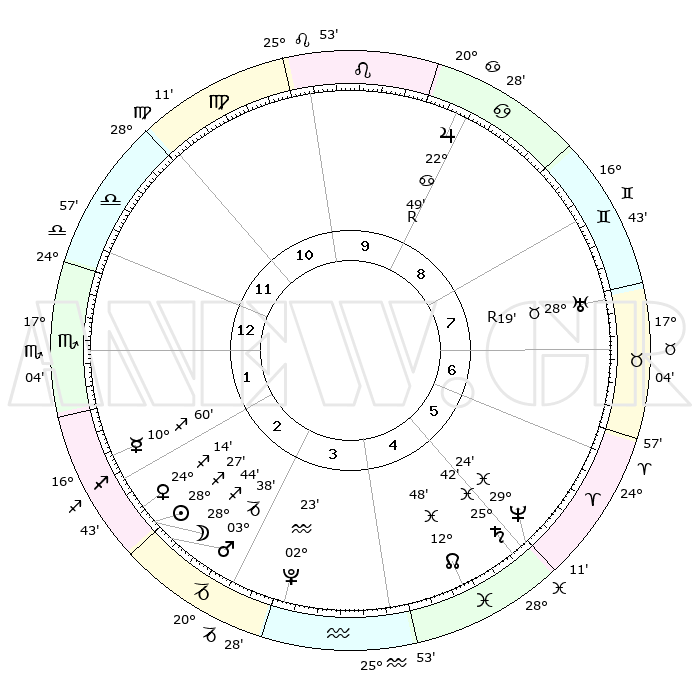 | | ΘΕΣΕΙΣ ΠΛΑΝΗΤΩΝ ΑΣΤΡΟΛΟΓΙΚΟΥ ΧΑΡΤΗ ΤΗΣ ΣΤΙΓΜΗΣ ΑΥΤΗΣ | | | | Πλανήτης | Ζώδιο | Μοίρες | Δεκαήμ. | Σε οίκο | Απόκλιση | | Ακμές των οίκων | | Ηλιος | Τοξότης | 28°23' | Τρίτο | 2 | 23 S 25 | | 1ος | 28°20' | Ζυγός | | Σελήνη | Τοξότης | 27°57' | Τρίτο | 2 | 28 S 14 | | 2ος | 26°39' | Σκορπιός | | Ερμής | Τοξότης | 10°54' | Δεύτερο | 2 | 21 S 11 | | 3ος | 28°28' | Τοξότης | | Αφροδίτη | Τοξότης | 24°09' | Τρίτο | 2 | 23 S 21 | | 4ος | 02°33' | Υδροχόος | | Αρης | Αιγόκερως | 03°35' | Πρώτο | 3 | 24 S 12 | | 5ος | 05°29' | Ιχθείς | | Δίας | Καρκίνος | 22°49'R | Τρίτο | 9 | 21 N 42 | | 6ος | 04°18' | Κριός | | Κρόνος | Ιχθείς | 25°42' | Τρίτο | 5 | 03 S 49 | | 7ος | 28°20' | Κριός | | Ουρανός | Ταύρος | 28°19'R | Τρίτο | 8 | 19 N 35 | | 8ος | 26°39' | Ταύρος | | Ποσειδώνας | Ιχθείς | 29°24' | Τρίτο | 5 | 01 S 28 | | 9ος | 28°28' | Δίδυμοι | | Πλούτωνας | Υδροχόος | 02°23' | Πρώτο | 3 | 23 S 18 | | 10ος | 02°33' | Λέων | | Β. Δεσμός | Ιχθείς | 12°48' | Δεύτερο | 5 | 06 S 45 | | 11ος | 05°29' | Παρθένος | | Ωροσκόπος | Ζυγός | 28°20' | Τρίτο | | | 12ος | 04°18' | Ζυγός | | Μεσουράνημα | Λέων | 02°33' | Πρώτο | | | |