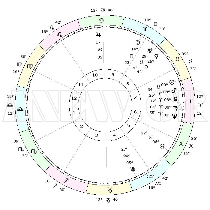 | | ΘΕΣΕΙΣ ΠΛΑΝΗΤΩΝ ΑΣΤΡΟΛΟΓΙΚΟΥ ΧΑΡΤΗ ΤΗΣ ΣΤΙΓΜΗΣ ΑΥΤΗΣ | | | | Πλανήτης | Ζώδιο | Μοίρες | Δεκαήμ. | Σε οίκο | Απόκλιση | | Ακμές των οίκων | | Ηλιος | Ταύρος | 00°31' | Πρώτο | 8 | 11 N 39 | | 1ος | 25°37' | Παρθένος | | Σελήνη | Δίδυμοι | 13°33' | Δεύτερο | 9 | 27 N 27 | | 2ος | 21°53' | Ζυγός | | Ερμής | Κριός | 08°07' | Πρώτο | 7 | 00 N 49 | | 3ος | 22°08' | Σκορπιός | | Αφροδίτη | Ταύρος | 25°39' | Τρίτο | 9 | 19 N 35 | | 4ος | 25°05' | Τοξότης | | Αρης | Κριός | 08°22' | Πρώτο | 7 | 02 N 27 | | 5ος | 28°07' | Αιγόκερως | | Δίας | Καρκίνος | 17°35' | Δεύτερο | 10 | 22 N 39 | | 6ος | 28°44' | Υδροχόος | | Κρόνος | Κριός | 08°03' | Πρώτο | 7 | 01 N 13 | | 7ος | 25°37' | Ιχθείς | | Ουρανός | Ταύρος | 29°43' | Τρίτο | 9 | 19 N 55 | | 8ος | 21°53' | Κριός | | Ποσειδώνας | Κριός | 02°55' | Πρώτο | 7 | 00 S 03 | | 9ος | 22°08' | Ταύρος | | Πλούτωνας | Υδροχόος | 05°27' | Πρώτο | 5 | 22 S 48 | | 10ος | 25°05' | Δίδυμοι | | Β. Δεσμός | Ιχθείς | 06°22' | Πρώτο | 6 | 09 S 10 | | 11ος | 28°07' | Καρκίνος | | Ωροσκόπος | Παρθένος | 25°37' | Τρίτο | | | 12ος | 28°43' | Λέων | | Μεσουράνημα | Δίδυμοι | 25°05' | Τρίτο | | | |