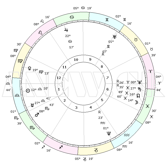 | ΘΕΣΕΙΣ ΠΛΑΝΗΤΩΝ ΑΣΤΡΟΛΟΓΙΚΟΥ ΧΑΡΤΗ ΤΗΣ ΣΤΙΓΜΗΣ ΑΥΤΗΣ | | Πλανήτης | Ζώδιο | Μοίρες | Δεκαήμ. | Σε οίκο | Απόκλιση | | Ακμές των οίκων | Ηλιος | Ζυγός | 12°03' | Δεύτερο | 2 | 04 S 46 | | 1ος | 29°27' | Λέων | Σελήνη | Ιχθείς | 13°18' | Δεύτερο | 7 | 06 S 59 | | 2ος | 23°15' | Παρθένος | Ερμής | Ζυγός | 27°30' | Τρίτο | 3 | 11 S 08 | | 3ος | 21°52' | Ζυγός | Αφροδίτη | Παρθένος | 19°04' | Δεύτερο | 1 | 05 N 36 | | 4ος | 24°47' | Σκορπιός | Αρης | Σκορπιός | 08°38' | Πρώτο | 3 | 14 S 29 | | 5ος | 29°01' | Τοξότης | Δίας | Καρκίνος | 22°56' | Τρίτο | 11 | 21 N 31 | | 6ος | 01°00' | Υδροχόος | Κρόνος | Ιχθείς | 27°35'R | Τρίτο | 8 | 03 S 16 | | 7ος | 29°27' | Υδροχόος | Ουρανός | Δίδυμοι | 01°07'R | Πρώτο | 10 | 20 N 10 | | 8ος | 23°15' | Ιχθείς | Ποσειδώνας | Κριός | 00°26'R | Πρώτο | 8 | 01 S 05 | | 9ος | 21°52' | Κριός | Πλούτωνας | Υδροχόος | 01°23'R | Πρώτο | 6 | 23 S 32 | | 10ος | 24°47' | Ταύρος | Β. Δεσμός | Ιχθείς | 16°50' | Δεύτερο | 7 | 05 S 12 | | 11ος | 29°01' | Δίδυμοι | Ωροσκόπος | Λέων | 29°27' | Τρίτο | | | 12ος | 01°00' | Λέων | Μεσουράνημα | Ταύρος | 24°47' | Τρίτο | | | |