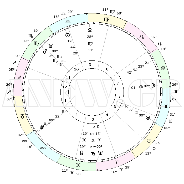 | ΘΕΣΕΙΣ ΠΛΑΝΗΤΩΝ ΑΣΤΡΟΛΟΓΙΚΟΥ ΧΑΡΤΗ ΤΗΣ ΣΤΙΓΜΗΣ ΑΥΤΗΣ | | Πλανήτης | Ζώδιο | Μοίρες | Δεκαήμ. | Σε οίκο | Απόκλιση | | Ακμές των οίκων | Ηλιος | Ζυγός | 19°14' | Δεύτερο | 11 | 07 S 32 | | 1ος | 26°04' | Σκορπιός | Σελήνη | Καρκίνος | 00°36' | Πρώτο | 8 | 28 N 31 | | 2ος | 26°41' | Τοξότης | Ερμής | Σκορπιός | 08°17' | Πρώτο | 12 | 15 S 37 | | 3ος | 01°45' | Υδροχόος | Αφροδίτη | Παρθένος | 28°04' | Τρίτο | 10 | 02 N 08 | | 4ος | 07°40' | Ιχθείς | Αρης | Σκορπιός | 13°39' | Δεύτερο | 12 | 16 S 07 | | 5ος | 09°10' | Κριός | Δίας | Καρκίνος | 23°41' | Τρίτο | 8 | 21 N 24 | | 6ος | 04°45' | Ταύρος | Κρόνος | Ιχθείς | 27°04'R | Τρίτο | 4 | 03 S 28 | | 7ος | 26°04' | Ταύρος | Ουρανός | Δίδυμοι | 00°56'R | Πρώτο | 7 | 20 N 08 | | 8ος | 26°41' | Δίδυμοι | Ποσειδώνας | Κριός | 00°15'R | Πρώτο | 4 | 01 S 10 | | 9ος | 01°45' | Λέων | Πλούτωνας | Υδροχόος | 01°22'R | Πρώτο | 2 | 23 S 32 | | 10ος | 07°40' | Παρθένος | Β. Δεσμός | Ιχθείς | 16°27' | Δεύτερο | 4 | 05 S 21 | | 11ος | 09°10' | Ζυγός | Ωροσκόπος | Σκορπιός | 26°04' | Τρίτο | | | 12ος | 04°45' | Σκορπιός | Μεσουράνημα | Παρθένος | 07°40' | Πρώτο | | | |