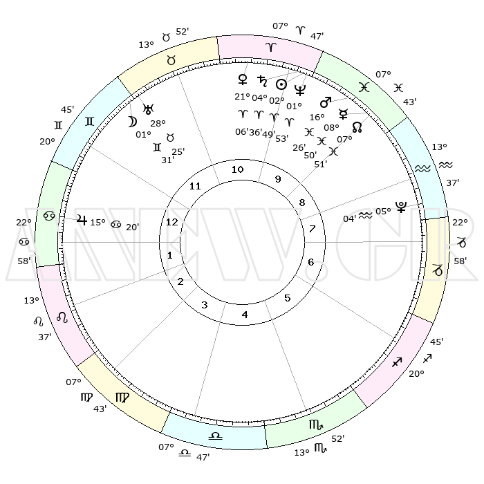 | | ΘΕΣΕΙΣ ΠΛΑΝΗΤΩΝ ΑΣΤΡΟΛΟΓΙΚΟΥ ΧΑΡΤΗ ΤΗΣ ΣΤΙΓΜΗΣ ΑΥΤΗΣ | | | | Πλανήτης | Ζώδιο | Μοίρες | Δεκαήμ. | Σε οίκο | Απόκλιση | | Ακμές των οίκων | | Ηλιος | Κριός | 02°45' | Πρώτο | 10 | 01 N 06 | | 1ος | 29°50' | Δίδυμοι | | Σελήνη | Δίδυμοι | 00°26' | Πρώτο | 12 | 25 N 18 | | 2ος | 20°38' | Καρκίνος | | Ερμής | Ιχθείς | 08°49' | Πρώτο | 10 | 07 S 55 | | 3ος | 12°26' | Λέων | | Αφροδίτη | Κριός | 21°01' | Τρίτο | 11 | 07 N 29 | | 4ος | 08°43' | Παρθένος | | Αρης | Ιχθείς | 16°22' | Δεύτερο | 10 | 06 S 22 | | 5ος | 12°38' | Ζυγός | | Δίας | Καρκίνος | 15°20' | Δεύτερο | 1 | 22 N 55 | | 6ος | 22°38' | Σκορπιός | | Κρόνος | Κριός | 04°35' | Πρώτο | 10 | 00 S 08 | | 7ος | 29°50' | Τοξότης | | Ουρανός | Ταύρος | 28°25' | Τρίτο | 12 | 19 N 38 | | 8ος | 20°38' | Αιγόκερως | | Ποσειδώνας | Κριός | 01°53' | Πρώτο | 10 | 00 S 27 | | 9ος | 12°26' | Υδροχόος | | Πλούτωνας | Υδροχόος | 05°04' | Πρώτο | 8 | 22 S 48 | | 10ος | 08°43' | Ιχθείς | | Β. Δεσμός | Ιχθείς | 07°52' | Πρώτο | 9 | 08 S 37 | | 11ος | 12°38' | Κριός | | Ωροσκόπος | Δίδυμοι | 29°50' | Τρίτο | | | 12ος | 22°38' | Ταύρος | | Μεσουράνημα | Ιχθείς | 08°43' | Πρώτο | | | |