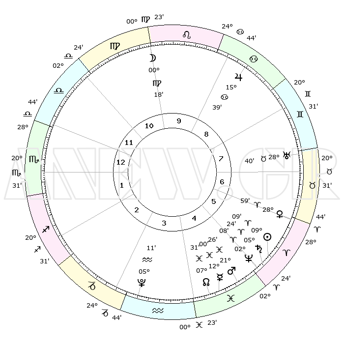 | | ΘΕΣΕΙΣ ΠΛΑΝΗΤΩΝ ΑΣΤΡΟΛΟΓΙΚΟΥ ΧΑΡΤΗ ΤΗΣ ΣΤΙΓΜΗΣ ΑΥΤΗΣ | | | | Πλανήτης | Ζώδιο | Μοίρες | Δεκαήμ. | Σε οίκο | Απόκλιση | | Ακμές των οίκων | | Ηλιος | Κριός | 09°05' | Πρώτο | 6 | 03 N 36 | | 1ος | 01°12' | Σκορπιός | | Σελήνη | Λέων | 29°25' | Τρίτο | 10 | 12 N 28 | | 2ος | 29°41' | Σκορπιός | | Ερμής | Ιχθείς | 11°58' | Δεύτερο | 5 | 07 S 56 | | 3ος | 01°44' | Αιγόκερως | | Αφροδίτη | Κριός | 28°54' | Τρίτο | 6 | 10 N 35 | | 4ος | 06°00' | Υδροχόος | | Αρης | Ιχθείς | 21°23' | Τρίτο | 5 | 04 S 23 | | 5ος | 08°55' | Ιχθείς | | Δίας | Καρκίνος | 15°39' | Δεύτερο | 9 | 22 N 53 | | 6ος | 07°28' | Κριός | | Κρόνος | Κριός | 05°23' | Πρώτο | 5 | 00 N 11 | | 7ος | 01°12' | Ταύρος | | Ουρανός | Ταύρος | 28°40' | Τρίτο | 7 | 19 N 41 | | 8ος | 29°41' | Ταύρος | | Ποσειδώνας | Κριός | 02°08' | Πρώτο | 5 | 00 S 21 | | 9ος | 01°44' | Καρκίνος | | Πλούτωνας | Υδροχόος | 05°11' | Πρώτο | 3 | 22 S 48 | | 10ος | 06°00' | Λέων | | Β. Δεσμός | Ιχθείς | 07°31' | Πρώτο | 4 | 08 S 45 | | 11ος | 08°55' | Παρθένος | | Ωροσκόπος | Σκορπιός | 01°12' | Πρώτο | | | 12ος | 07°28' | Ζυγός | | Μεσουράνημα | Λέων | 06°00' | Πρώτο | | | |