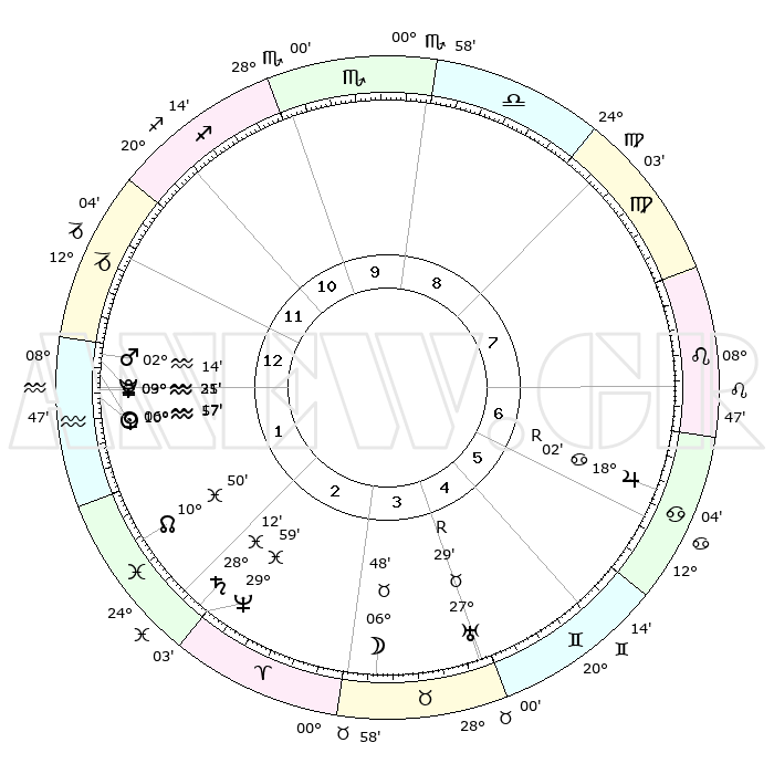 | | ΘΕΣΕΙΣ ΠΛΑΝΗΤΩΝ ΑΣΤΡΟΛΟΓΙΚΟΥ ΧΑΡΤΗ ΤΗΣ ΣΤΙΓΜΗΣ ΑΥΤΗΣ | | | | Πλανήτης | Ζώδιο | Μοίρες | Δεκαήμ. | Σε οίκο | Απόκλιση | | Ακμές των οίκων | | Ηλιος | Υδροχόος | 06°13' | Πρώτο | 1 | 18 S 43 | | 1ος | 12°56' | Αιγόκερως | | Σελήνη | Ταύρος | 05°55' | Πρώτο | 4 | 17 N 35 | | 2ος | 23°23' | Υδροχόος | | Ερμής | Υδροχόος | 09°19' | Πρώτο | 1 | 19 S 56 | | 3ος | 03°36' | Κριός | | Αφροδίτη | Υδροχόος | 10°53' | Δεύτερο | 1 | 18 S 43 | | 4ος | 05°14' | Ταύρος | | Αρης | Υδροχόος | 02°11' | Πρώτο | 1 | 20 S 40 | | 5ος | 29°41' | Ταύρος | | Δίας | Καρκίνος | 18°02'R | Δεύτερο | 7 | 22 N 31 | | 6ος | 20°57' | Δίδυμοι | | Κρόνος | Ιχθείς | 28°12' | Τρίτο | 2 | 02 S 43 | | 7ος | 12°56' | Καρκίνος | | Ουρανός | Ταύρος | 27°29'R | Τρίτο | 4 | 19 N 25 | | 8ος | 23°23' | Λέων | | Ποσειδώνας | Ιχθείς | 29°59' | Τρίτο | 2 | 01 S 13 | | 9ος | 03°36' | Ζυγός | | Πλούτωνας | Υδροχόος | 03°31' | Πρώτο | 1 | 23 S 03 | | 10ος | 05°14' | Σκορπιός | | Β. Δεσμός | Ιχθείς | 10°50' | Δεύτερο | 2 | 07 S 30 | | 11ος | 29°41' | Σκορπιός | | Ωροσκόπος | Αιγόκερως | 12°56' | Δεύτερο | | | 12ος | 20°57' | Τοξότης | | Μεσουράνημα | Σκορπιός | 05°14' | Πρώτο | | | |