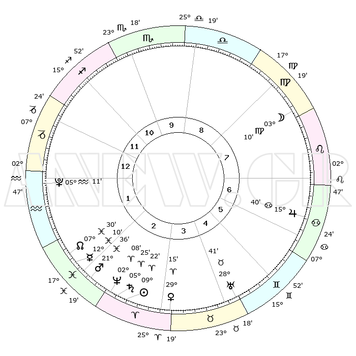 | | ΘΕΣΕΙΣ ΠΛΑΝΗΤΩΝ ΑΣΤΡΟΛΟΓΙΚΟΥ ΧΑΡΤΗ ΤΗΣ ΣΤΙΓΜΗΣ ΑΥΤΗΣ | | | | Πλανήτης | Ζώδιο | Μοίρες | Δεκαήμ. | Σε οίκο | Απόκλιση | | Ακμές των οίκων | | Ηλιος | Κριός | 09°17' | Πρώτο | 3 | 03 N 41 | | 1ος | 03°21' | Αιγόκερως | | Σελήνη | Παρθένος | 02°09' | Πρώτο | 8 | 11 N 16 | | 2ος | 11°21' | Υδροχόος | | Ερμής | Ιχθείς | 12°07' | Δεύτερο | 2 | 07 S 55 | | 3ος | 21°32' | Ιχθείς | | Αφροδίτη | Κριός | 29°10' | Τρίτο | 4 | 10 N 41 | | 4ος | 24°55' | Κριός | | Αρης | Ιχθείς | 21°33' | Τρίτο | 3 | 04 S 19 | | 5ος | 20°43' | Ταύρος | | Δίας | Καρκίνος | 15°39' | Δεύτερο | 7 | 22 N 53 | | 6ος | 12°19' | Δίδυμοι | | Κρόνος | Κριός | 05°25' | Πρώτο | 3 | 00 N 12 | | 7ος | 03°21' | Καρκίνος | | Ουρανός | Ταύρος | 28°41' | Τρίτο | 5 | 19 N 42 | | 8ος | 11°21' | Λέων | | Ποσειδώνας | Κριός | 02°08' | Πρώτο | 3 | 00 S 21 | | 9ος | 21°32' | Παρθένος | | Πλούτωνας | Υδροχόος | 05°11' | Πρώτο | 1 | 22 S 48 | | 10ος | 24°55' | Ζυγός | | Β. Δεσμός | Ιχθείς | 07°31' | Πρώτο | 2 | 08 S 45 | | 11ος | 20°43' | Σκορπιός | | Ωροσκόπος | Αιγόκερως | 03°21' | Πρώτο | | | 12ος | 12°19' | Τοξότης | | Μεσουράνημα | Ζυγός | 24°55' | Τρίτο | | | |