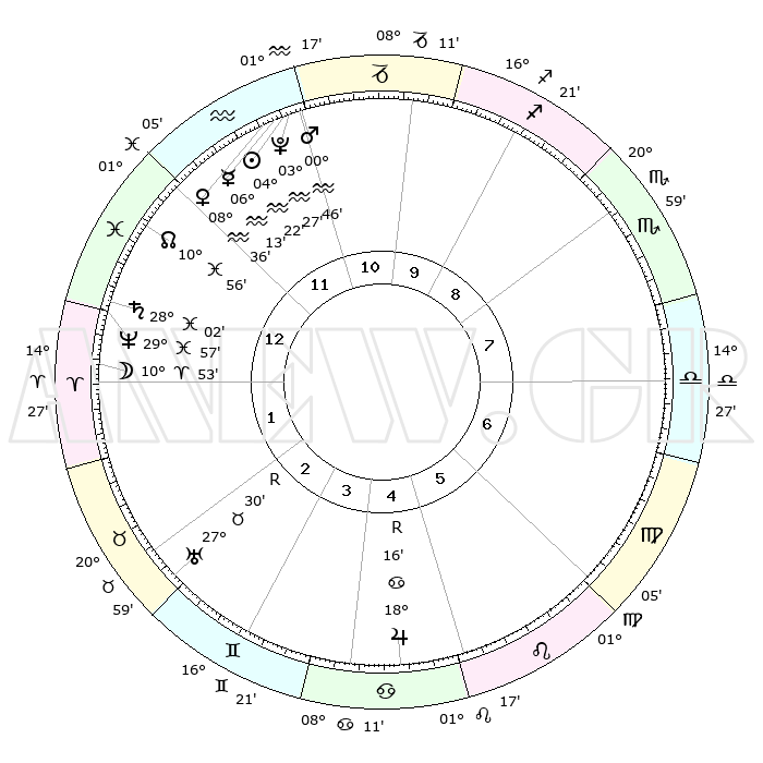 | | ΘΕΣΕΙΣ ΠΛΑΝΗΤΩΝ ΑΣΤΡΟΛΟΓΙΚΟΥ ΧΑΡΤΗ ΤΗΣ ΣΤΙΓΜΗΣ ΑΥΤΗΣ | | | | Πλανήτης | Ζώδιο | Μοίρες | Δεκαήμ. | Σε οίκο | Απόκλιση | | Ακμές των οίκων | | Ηλιος | Υδροχόος | 04°18' | Πρώτο | 12 | 19 S 11 | | 1ος | 00°23' | Ιχθείς | | Σελήνη | Κριός | 09°51' | Πρώτο | 1 | 06 N 20 | | 2ος | 15°46' | Κριός | | Ερμής | Υδροχόος | 06°05' | Πρώτο | 12 | 20 S 46 | | 3ος | 18°25' | Ταύρος | | Αφροδίτη | Υδροχόος | 08°30' | Πρώτο | 12 | 19 S 18 | | 4ος | 12°46' | Δίδυμοι | | Αρης | Υδροχόος | 00°43' | Πρώτο | 12 | 20 S 59 | | 5ος | 04°27' | Καρκίνος | | Δίας | Καρκίνος | 18°16'R | Δεύτερο | 5 | 22 N 29 | | 6ος | 28°03' | Καρκίνος | | Κρόνος | Ιχθείς | 28°02' | Τρίτο | 1 | 02 S 48 | | 7ος | 00°23' | Παρθένος | | Ουρανός | Ταύρος | 27°30'R | Τρίτο | 3 | 19 N 25 | | 8ος | 15°46' | Ζυγός | | Ποσειδώνας | Ιχθείς | 29°57' | Τρίτο | 1 | 01 S 14 | | 9ος | 18°25' | Σκορπιός | | Πλούτωνας | Υδροχόος | 03°27' | Πρώτο | 12 | 23 S 04 | | 10ος | 12°46' | Τοξότης | | Β. Δεσμός | Ιχθείς | 10°56' | Δεύτερο | 1 | 07 S 28 | | 11ος | 04°27' | Αιγόκερως | | Ωροσκόπος | Ιχθείς | 00°23' | Πρώτο | | | 12ος | 28°03' | Αιγόκερως | | Μεσουράνημα | Τοξότης | 12°46' | Δεύτερο | | | |