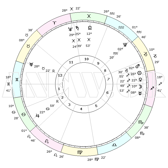 | | ΘΕΣΕΙΣ ΠΛΑΝΗΤΩΝ ΑΣΤΡΟΛΟΓΙΚΟΥ ΧΑΡΤΗ ΤΗΣ ΣΤΙΓΜΗΣ ΑΥΤΗΣ | | | | Πλανήτης | Ζώδιο | Μοίρες | Δεκαήμ. | Σε οίκο | Απόκλιση | | Ακμές των οίκων | | Ηλιος | Τοξότης | 26°30' | Τρίτο | 1 | 23 S 23 | | 1ος | 10°04' | Τοξότης | | Σελήνη | Τοξότης | 05°48' | Πρώτο | 12 | 26 S 09 | | 2ος | 12°48' | Αιγόκερως | | Ερμής | Τοξότης | 08°17' | Πρώτο | 12 | 20 S 34 | | 3ος | 20°12' | Υδροχόος | | Αφροδίτη | Τοξότης | 21°50' | Τρίτο | 1 | 23 S 09 | | 4ος | 26°11' | Ιχθείς | | Αρης | Αιγόκερως | 02°11' | Πρώτο | 1 | 24 S 13 | | 5ος | 25°48' | Κριός | | Δίας | Καρκίνος | 23°02'R | Τρίτο | 8 | 21 N 40 | | 6ος | 19°32' | Ταύρος | | Κρόνος | Ιχθείς | 25°38' | Τρίτο | 3 | 03 S 51 | | 7ος | 10°04' | Δίδυμοι | | Ουρανός | Ταύρος | 28°23'R | Τρίτο | 6 | 19 N 36 | | 8ος | 12°48' | Καρκίνος | | Ποσειδώνας | Ιχθείς | 29°23' | Τρίτο | 4 | 01 S 28 | | 9ος | 20°12' | Λέων | | Πλούτωνας | Υδροχόος | 02°20' | Πρώτο | 2 | 23 S 18 | | 10ος | 26°11' | Παρθένος | | Β. Δεσμός | Ιχθείς | 12°54' | Δεύτερο | 3 | 06 S 43 | | 11ος | 25°48' | Ζυγός | | Ωροσκόπος | Τοξότης | 10°04' | Δεύτερο | | | 12ος | 19°32' | Σκορπιός | | Μεσουράνημα | Παρθένος | 26°11' | Τρίτο | | | |