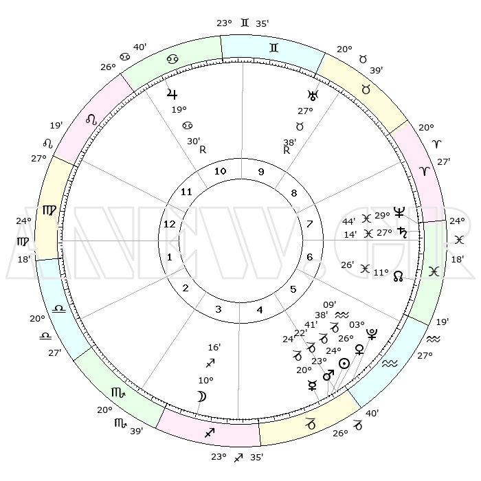 | | ΘΕΣΕΙΣ ΠΛΑΝΗΤΩΝ ΑΣΤΡΟΛΟΓΙΚΟΥ ΧΑΡΤΗ ΤΗΣ ΣΤΙΓΜΗΣ ΑΥΤΗΣ | | | | Πλανήτης | Ζώδιο | Μοίρες | Δεκαήμ. | Σε οίκο | Απόκλιση | | Ακμές των οίκων | | Ηλιος | Αιγόκερως | 24°37' | Τρίτο | 5 | 21 S 12 | | 1ος | 06°09' | Παρθένος | | Σελήνη | Τοξότης | 09°32' | Πρώτο | 4 | 26 S 56 | | 2ος | 00°38' | Ζυγός | | Ερμής | Αιγόκερως | 20°18' | Τρίτο | 5 | 23 S 39 | | 3ος | 29°49' | Ζυγός | | Αφροδίτη | Αιγόκερως | 26°34' | Τρίτο | 5 | 21 S 47 | | 4ος | 02°46' | Τοξότης | | Αρης | Αιγόκερως | 23°19' | Τρίτο | 5 | 22 S 22 | | 5ος | 06°34' | Αιγόκερως | | Δίας | Καρκίνος | 19°30'R | Δεύτερο | 11 | 22 N 17 | | 6ος | 08°05' | Υδροχόος | | Κρόνος | Ιχθείς | 27°14' | Τρίτο | 7 | 03 S 08 | | 7ος | 06°09' | Ιχθείς | | Ουρανός | Ταύρος | 27°38'R | Τρίτο | 9 | 19 N 26 | | 8ος | 00°38' | Κριός | | Ποσειδώνας | Ιχθείς | 29°44' | Τρίτο | 7 | 01 S 19 | | 9ος | 29°49' | Κριός | | Πλούτωνας | Υδροχόος | 03°09' | Πρώτο | 5 | 23 S 08 | | 10ος | 02°46' | Δίδυμοι | | Β. Δεσμός | Ιχθείς | 11°26' | Δεύτερο | 7 | 07 S 16 | | 11ος | 06°34' | Καρκίνος | | Ωροσκόπος | Παρθένος | 06°09' | Πρώτο | | | 12ος | 08°05' | Λέων | | Μεσουράνημα | Δίδυμοι | 02°46' | Πρώτο | | | |