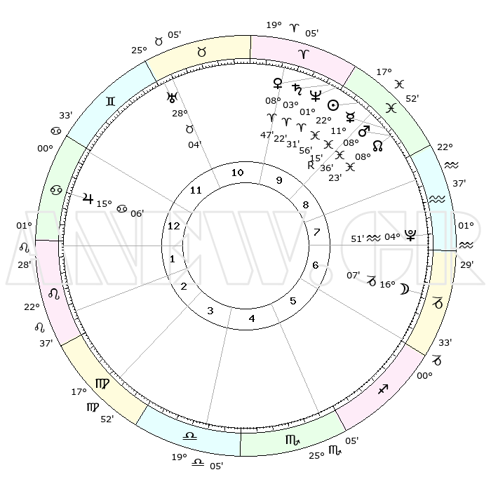 | | ΘΕΣΕΙΣ ΠΛΑΝΗΤΩΝ ΑΣΤΡΟΛΟΓΙΚΟΥ ΧΑΡΤΗ ΤΗΣ ΣΤΙΓΜΗΣ ΑΥΤΗΣ | | | | Πλανήτης | Ζώδιο | Μοίρες | Δεκαήμ. | Σε οίκο | Απόκλιση | | Ακμές των οίκων | | Ηλιος | Ιχθείς | 22°52' | Τρίτο | 9 | 02 S 50 | | 1ος | 13°41' | Καρκίνος | | Σελήνη | Αιγόκερως | 15°23' | Δεύτερο | 7 | 26 S 46 | | 2ος | 04°06' | Λέων | | Ερμής | Ιχθείς | 11°17'R | Δεύτερο | 9 | 04 S 46 | | 3ος | 27°06' | Λέων | | Αφροδίτη | Κριός | 08°43' | Πρώτο | 10 | 02 N 27 | | 4ος | 25°41' | Παρθένος | | Αρης | Ιχθείς | 08°34' | Πρώτο | 9 | 09 S 22 | | 5ος | 01°18' | Σκορπιός | | Δίας | Καρκίνος | 15°06' | Δεύτερο | 1 | 22 N 56 | | 6ος | 09°43' | Τοξότης | | Κρόνος | Κριός | 03°21' | Πρώτο | 10 | 00 S 37 | | 7ος | 13°41' | Αιγόκερως | | Ουρανός | Ταύρος | 28°04' | Τρίτο | 11 | 19 N 33 | | 8ος | 04°06' | Υδροχόος | | Ποσειδώνας | Κριός | 01°30' | Πρώτο | 10 | 00 S 36 | | 9ος | 27°06' | Υδροχόος | | Πλούτωνας | Υδροχόος | 04°51' | Πρώτο | 8 | 22 S 50 | | 10ος | 25°41' | Ιχθείς | | Β. Δεσμός | Ιχθείς | 08°23' | Πρώτο | 9 | 08 S 25 | | 11ος | 01°18' | Ταύρος | | Ωροσκόπος | Καρκίνος | 13°41' | Δεύτερο | | | 12ος | 09°43' | Δίδυμοι | | Μεσουράνημα | Ιχθείς | 25°41' | Τρίτο | | | |