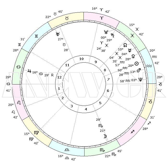 | | ΘΕΣΕΙΣ ΠΛΑΝΗΤΩΝ ΑΣΤΡΟΛΟΓΙΚΟΥ ΧΑΡΤΗ ΤΗΣ ΣΤΙΓΜΗΣ ΑΥΤΗΣ | | | | Πλανήτης | Ζώδιο | Μοίρες | Δεκαήμ. | Σε οίκο | Απόκλιση | | Ακμές των οίκων | | Ηλιος | Υδροχόος | 20°47' | Τρίτο | 8 | 14 S 34 | | 1ος | 12°39' | Καρκίνος | | Σελήνη | Σκορπιός | 20°48' | Τρίτο | 5 | 22 S 45 | | 2ος | 03°04' | Λέων | | Ερμής | Ιχθείς | 04°30' | Πρώτο | 9 | 10 S 46 | | 3ος | 25°58' | Λέων | | Αφροδίτη | Υδροχόος | 28°53' | Τρίτο | 9 | 13 S 13 | | 4ος | 24°23' | Παρθένος | | Αρης | Υδροχόος | 13°26' | Δεύτερο | 8 | 17 S 49 | | 5ος | 29°54' | Ζυγός | | Δίας | Καρκίνος | 16°29'R | Δεύτερο | 1 | 22 N 44 | | 6ος | 08°28' | Τοξότης | | Κρόνος | Ιχθείς | 29°38' | Τρίτο | 10 | 02 S 08 | | 7ος | 12°39' | Αιγόκερως | | Ουρανός | Ταύρος | 27°28' | Τρίτο | 11 | 19 N 25 | | 8ος | 03°04' | Υδροχόος | | Ποσειδώνας | Κριός | 00°24' | Πρώτο | 10 | 01 S 03 | | 9ος | 25°58' | Υδροχόος | | Πλούτωνας | Υδροχόος | 03°58' | Πρώτο | 8 | 22 S 58 | | 10ος | 24°23' | Ιχθείς | | Β. Δεσμός | Ιχθείς | 10°05' | Δεύτερο | 9 | 07 S 47 | | 11ος | 29°54' | Κριός | | Ωροσκόπος | Καρκίνος | 12°39' | Δεύτερο | | | 12ος | 08°28' | Δίδυμοι | | Μεσουράνημα | Ιχθείς | 24°23' | Τρίτο | | | |