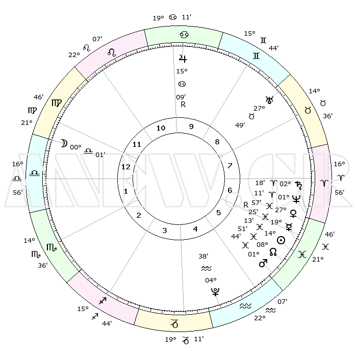 | | ΘΕΣΕΙΣ ΠΛΑΝΗΤΩΝ ΑΣΤΡΟΛΟΓΙΚΟΥ ΧΑΡΤΗ ΤΗΣ ΣΤΙΓΜΗΣ ΑΥΤΗΣ | | | | Πλανήτης | Ζώδιο | Μοίρες | Δεκαήμ. | Σε οίκο | Απόκλιση | | Ακμές των οίκων | | Ηλιος | Ιχθείς | 14°09' | Δεύτερο | 6 | 06 S 14 | | 1ος | 29°58' | Παρθένος | | Σελήνη | Παρθένος | 29°17' | Τρίτο | 12 | 01 S 24 | | 2ος | 26°33' | Ζυγός | | Ερμής | Ιχθείς | 19°28'R | Δεύτερο | 6 | 00 S 47 | | 3ος | 26°59' | Σκορπιός | | Αφροδίτη | Ιχθείς | 27°52' | Τρίτο | 6 | 02 S 02 | | 4ος | 29°57' | Τοξότης | | Αρης | Ιχθείς | 01°42' | Πρώτο | 5 | 11 S 54 | | 5ος | 02°56' | Υδροχόος | | Δίας | Καρκίνος | 15°09'R | Δεύτερο | 10 | 22 N 55 | | 6ος | 03°22' | Ιχθείς | | Κρόνος | Κριός | 02°17' | Πρώτο | 7 | 01 S 03 | | 7ος | 29°58' | Ιχθείς | | Ουρανός | Ταύρος | 27°49' | Τρίτο | 9 | 19 N 30 | | 8ος | 26°33' | Κριός | | Ποσειδώνας | Κριός | 01°11' | Πρώτο | 7 | 00 S 44 | | 9ος | 26°59' | Ταύρος | | Πλούτωνας | Υδροχόος | 04°38' | Πρώτο | 5 | 22 S 52 | | 10ος | 29°57' | Δίδυμοι | | Β. Δεσμός | Ιχθείς | 08°51' | Πρώτο | 6 | 08 S 15 | | 11ος | 02°56' | Λέων | | Ωροσκόπος | Παρθένος | 29°58' | Τρίτο | | | 12ος | 03°22' | Παρθένος | | Μεσουράνημα | Δίδυμοι | 29°57' | Τρίτο | | | |