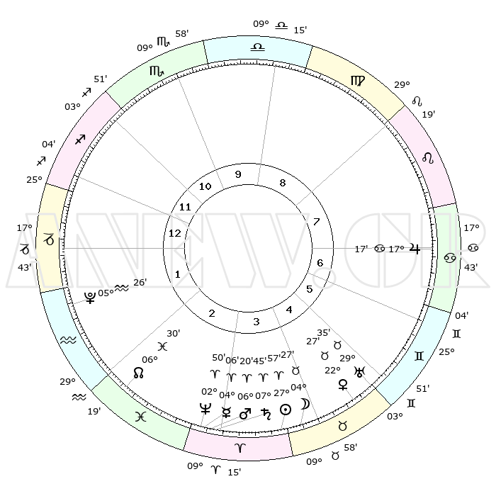 | | ΘΕΣΕΙΣ ΠΛΑΝΗΤΩΝ ΑΣΤΡΟΛΟΓΙΚΟΥ ΧΑΡΤΗ ΤΗΣ ΣΤΙΓΜΗΣ ΑΥΤΗΣ | | | | Πλανήτης | Ζώδιο | Μοίρες | Δεκαήμ. | Σε οίκο | Απόκλιση | | Ακμές των οίκων | | Ηλιος | Κριός | 27°54' | Τρίτο | 4 | 10 N 44 | | 1ος | 00°29' | Αιγόκερως | | Σελήνη | Ταύρος | 03°44' | Πρώτο | 4 | 16 N 44 | | 2ος | 07°45' | Υδροχόος | | Ερμής | Κριός | 04°02' | Πρώτο | 3 | 00 S 49 | | 3ος | 17°47' | Ιχθείς | | Αφροδίτη | Ταύρος | 22°23' | Τρίτο | 5 | 18 N 39 | | 4ος | 21°39' | Κριός | | Αρης | Κριός | 06°18' | Πρώτο | 3 | 01 N 37 | | 5ος | 17°53' | Ταύρος | | Δίας | Καρκίνος | 17°17' | Δεύτερο | 7 | 22 N 42 | | 6ος | 09°39' | Δίδυμοι | | Κρόνος | Κριός | 07°44' | Πρώτο | 3 | 01 N 06 | | 7ος | 00°29' | Καρκίνος | | Ουρανός | Ταύρος | 29°34' | Τρίτο | 5 | 19 N 53 | | 8ος | 07°45' | Λέων | | Ποσειδώνας | Κριός | 02°50' | Πρώτο | 3 | 00 S 05 | | 9ος | 17°47' | Παρθένος | | Πλούτωνας | Υδροχόος | 05°26' | Πρώτο | 1 | 22 S 47 | | 10ος | 21°39' | Ζυγός | | Β. Δεσμός | Ιχθείς | 06°30' | Πρώτο | 2 | 09 S 07 | | 11ος | 17°53' | Σκορπιός | | Ωροσκόπος | Αιγόκερως | 00°29' | Πρώτο | | | 12ος | 09°39' | Τοξότης | | Μεσουράνημα | Ζυγός | 21°39' | Τρίτο | | | |