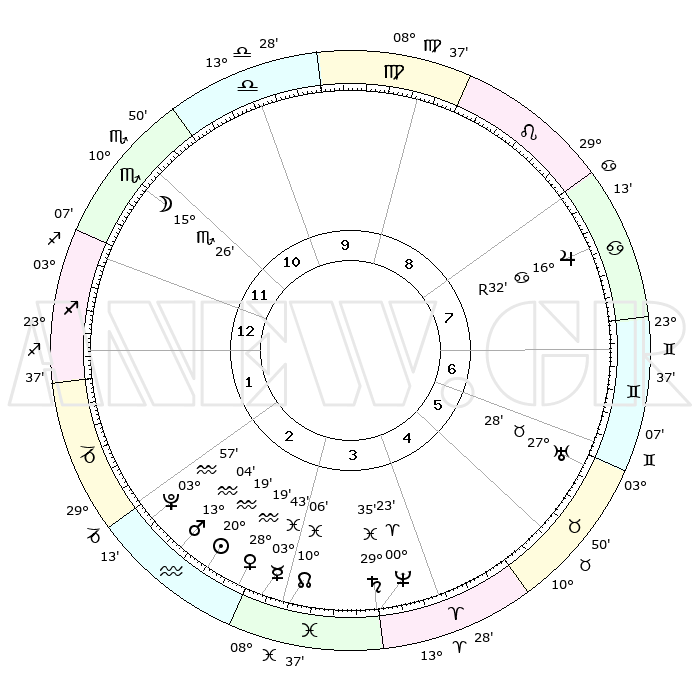 | | ΘΕΣΕΙΣ ΠΛΑΝΗΤΩΝ ΑΣΤΡΟΛΟΓΙΚΟΥ ΧΑΡΤΗ ΤΗΣ ΣΤΙΓΜΗΣ ΑΥΤΗΣ | | | | Πλανήτης | Ζώδιο | Μοίρες | Δεκαήμ. | Σε οίκο | Απόκλιση | | Ακμές των οίκων | | Ηλιος | Υδροχόος | 20°15' | Τρίτο | 3 | 14 S 44 | | 1ος | 02°19' | Τοξότης | | Σελήνη | Σκορπιός | 14°36' | Δεύτερο | 12 | 20 S 47 | | 2ος | 03°47' | Αιγόκερως | | Ερμής | Ιχθείς | 03°36' | Πρώτο | 3 | 11 S 10 | | 3ος | 09°52' | Υδροχόος | | Αφροδίτη | Υδροχόος | 28°14' | Τρίτο | 3 | 13 S 27 | | 4ος | 15°57' | Ιχθείς | | Αρης | Υδροχόος | 13°01' | Δεύτερο | 3 | 17 S 56 | | 5ος | 16°41' | Κριός | | Δίας | Καρκίνος | 16°32'R | Δεύτερο | 8 | 22 N 44 | | 6ος | 11°26' | Ταύρος | | Κρόνος | Ιχθείς | 29°35' | Τρίτο | 4 | 02 S 09 | | 7ος | 02°19' | Δίδυμοι | | Ουρανός | Ταύρος | 27°28' | Τρίτο | 6 | 19 N 24 | | 8ος | 03°47' | Καρκίνος | | Ποσειδώνας | Κριός | 00°23' | Πρώτο | 4 | 01 S 03 | | 9ος | 09°52' | Λέων | | Πλούτωνας | Υδροχόος | 03°57' | Πρώτο | 2 | 22 S 59 | | 10ος | 15°57' | Παρθένος | | Β. Δεσμός | Ιχθείς | 10°06' | Δεύτερο | 3 | 07 S 47 | | 11ος | 16°41' | Ζυγός | | Ωροσκόπος | Τοξότης | 02°19' | Πρώτο | | | 12ος | 11°26' | Σκορπιός | | Μεσουράνημα | Παρθένος | 15°57' | Δεύτερο | | | |