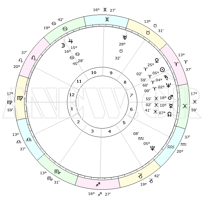 | | ΘΕΣΕΙΣ ΠΛΑΝΗΤΩΝ ΑΣΤΡΟΛΟΓΙΚΟΥ ΧΑΡΤΗ ΤΗΣ ΣΤΙΓΜΗΣ ΑΥΤΗΣ | | | | Πλανήτης | Ζώδιο | Μοίρες | Δεκαήμ. | Σε οίκο | Απόκλιση | | Ακμές των οίκων | | Ηλιος | Κριός | 05°54' | Πρώτο | 8 | 02 N 21 | | 1ος | 27°53' | Λέων | | Σελήνη | Καρκίνος | 15°47' | Δεύτερο | 11 | 26 N 39 | | 2ος | 21°31' | Παρθένος | | Ερμής | Ιχθείς | 09°60' | Πρώτο | 7 | 08 S 07 | | 3ος | 19°59' | Ζυγός | | Αφροδίτη | Κριός | 24°57' | Τρίτο | 9 | 09 N 03 | | 4ος | 22°52' | Σκορπιός | | Αρης | Ιχθείς | 18°52' | Δεύτερο | 7 | 05 S 23 | | 5ος | 27°12' | Τοξότης | | Δίας | Καρκίνος | 15°28' | Δεύτερο | 11 | 22 N 54 | | 6ος | 29°20' | Αιγόκερως | | Κρόνος | Κριός | 04°59' | Πρώτο | 8 | 00 N 02 | | 7ος | 27°53' | Υδροχόος | | Ουρανός | Ταύρος | 28°32' | Τρίτο | 10 | 19 N 40 | | 8ος | 21°31' | Ιχθείς | | Ποσειδώνας | Κριός | 02°00' | Πρώτο | 8 | 00 S 24 | | 9ος | 19°59' | Κριός | | Πλούτωνας | Υδροχόος | 05°07' | Πρώτο | 6 | 22 S 48 | | 10ος | 22°52' | Ταύρος | | Β. Δεσμός | Ιχθείς | 07°41' | Πρώτο | 7 | 08 S 41 | | 11ος | 27°12' | Δίδυμοι | | Ωροσκόπος | Λέων | 27°53' | Τρίτο | | | 12ος | 29°20' | Καρκίνος | | Μεσουράνημα | Ταύρος | 22°52' | Τρίτο | | | |