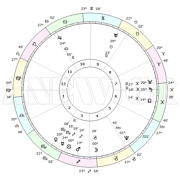 | | ΘΕΣΕΙΣ ΠΛΑΝΗΤΩΝ ΑΣΤΡΟΛΟΓΙΚΟΥ ΧΑΡΤΗ ΤΗΣ ΣΤΙΓΜΗΣ ΑΥΤΗΣ | | | | Πλανήτης | Ζώδιο | Μοίρες | Δεκαήμ. | Σε οίκο | Απόκλιση | | Ακμές των οίκων | | Ηλιος | Τοξότης | 00°53' | Πρώτο | 3 | 20 S 20 | | 1ος | 07°05' | Παρθένος | | Σελήνη | Τοξότης | 29°45' | Τρίτο | 4 | 28 S 16 | | 2ος | 01°40' | Ζυγός | | Ερμής | Σκορπιός | 24°60'R | Τρίτο | 3 | 17 S 42 | | 3ος | 00°55' | Σκορπιός | | Αφροδίτη | Σκορπιός | 20°04' | Τρίτο | 3 | 16 S 49 | | 4ος | 03°52' | Τοξότης | | Αρης | Τοξότης | 13°21' | Δεύτερο | 4 | 22 S 59 | | 5ος | 07°37' | Αιγόκερως | | Δίας | Καρκίνος | 24°56'R | Τρίτο | 11 | 21 N 16 | | 6ος | 09°05' | Υδροχόος | | Κρόνος | Ιχθείς | 25°18'R | Τρίτο | 7 | 04 S 04 | | 7ος | 07°05' | Ιχθείς | | Ουρανός | Ταύρος | 29°23'R | Τρίτο | 9 | 19 N 49 | | 8ος | 01°40' | Κριός | | Ποσειδώνας | Ιχθείς | 29°27'R | Τρίτο | 7 | 01 S 28 | | 9ος | 00°55' | Ταύρος | | Πλούτωνας | Υδροχόος | 01°45' | Πρώτο | 5 | 23 S 26 | | 10ος | 03°52' | Δίδυμοι | | Β. Δεσμός | Ιχθείς | 14°14' | Δεύτερο | 7 | 06 S 12 | | 11ος | 07°37' | Καρκίνος | | Ωροσκόπος | Παρθένος | 07°05' | Πρώτο | | | 12ος | 09°05' | Λέων | | Μεσουράνημα | Δίδυμοι | 03°52' | Πρώτο | | | |